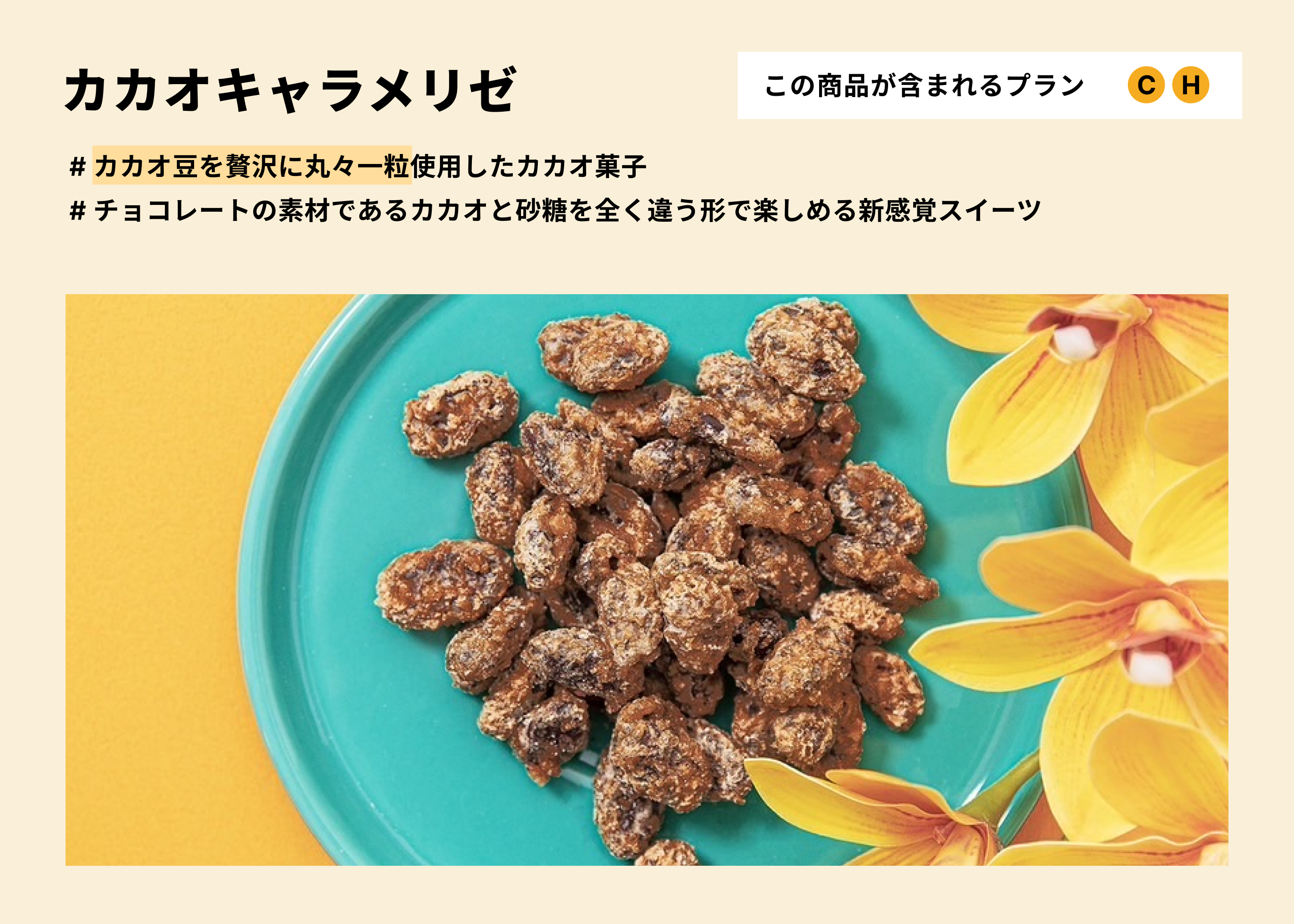 今回のクラウドファンディングのリターン品としては、定番商品のカカオテリーヌ、カカオクッキーズに加え、新商品のカカオキャラメリゼ、ジェラートをご用意しています。