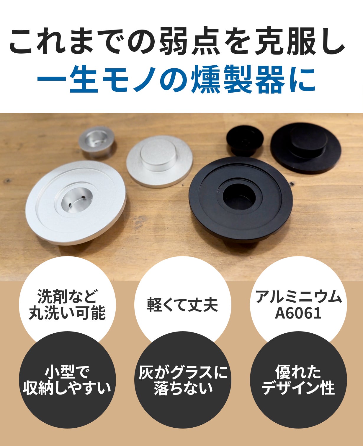 そして、前作の木製から8カ月の試作期間を経て、アルミニウム金属製(A6061)で軽くて丈夫で何度もお使いいただけるよう『ReSmoked』がVer. 2.0として、さらに進化を遂げました。
