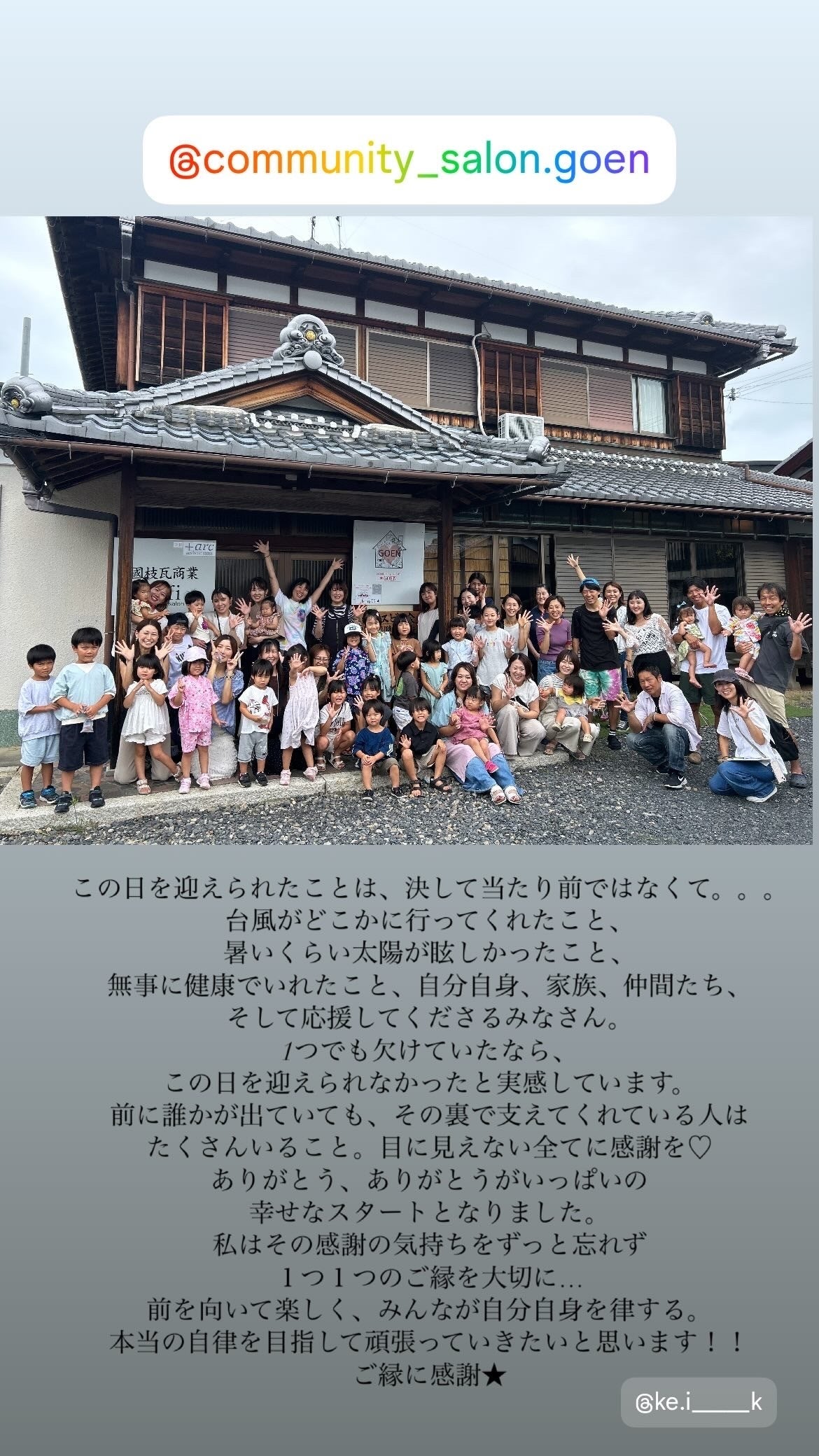 いつもありがとうございます^ ^本日、community salon★GOEN無事にオープンすることが出来ました。本当にみなさん、ありがとうございます。この日を迎えられたことは、決して当たり前ではなくて。。。台風がどこかに行ってくれたこと、暑いくらい太陽が眩しかったこと、無事に健康でいれたこと、自分自身、家族、仲間たち、そして応援してくださるみなさん。1つでも欠けていたなら、この日を迎えられなかったと実感しています。前に誰かが出ていても、その裏で支えてくれている人はたくさんいること。目に見えない全てに感謝です♡ありがとう、ありがとうがいっぱいの幸せなスタートとなりました!!みなさん、本当にありがとうございます。本日の来場者数は、90名。朝1番にママ達で看板を手作り!みんな集合してお披露目です!!マルシェも大盛況でした★守山市長もお越しくださり、みんなが、こんな居場所にしたい!っという想いをハートのメッセージに。さぁ、感謝の気持ちをずっと忘れず、1つ1つのご縁を大切に、前を向いて楽しく、みんなが自分自身を律する。本当の自律を目指して、みんなが繋がる場をつくっていきたいと思います。集まった資金がどのようにリノベーションなどで使用させていただいているのかもまた、ご報告出来ればと思います。本当にみなさんのお陰でこの日を迎えられました。ありがとうございます。そして、引き続き私達の活動を見守っていただけますと幸いです。