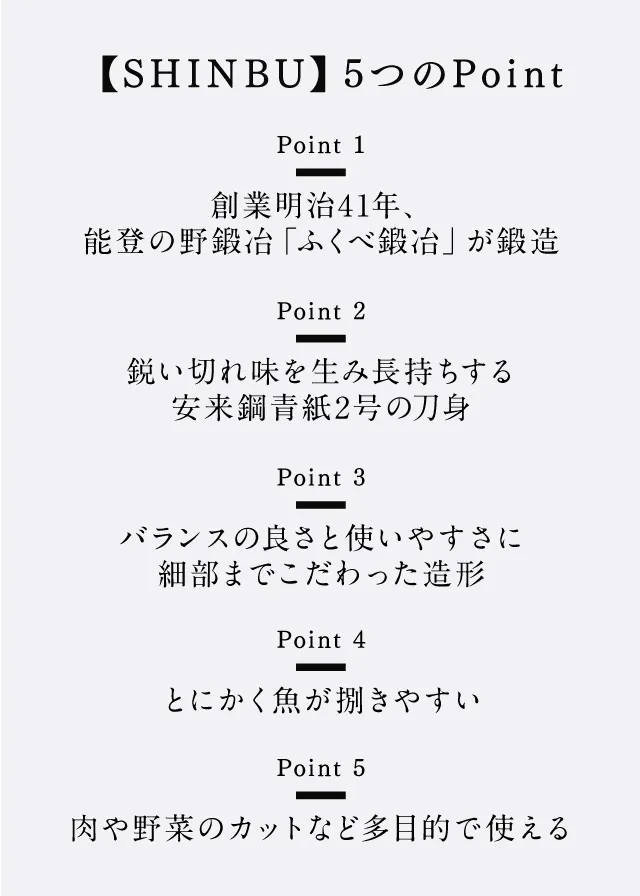 万能出刃包丁として硬い骨のある魚をはじめ様々な食材を扱う【SHINBU】では、刃金に鋭い切れ味が長期間持続する青紙2号を採用しました。