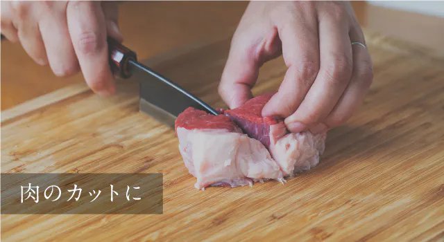 小ぶりでペティナイフのようにハンドリングがしやすい【SHINBU】は、ご家庭で肉や野菜のカットでも鋭い切れ味を発揮します。