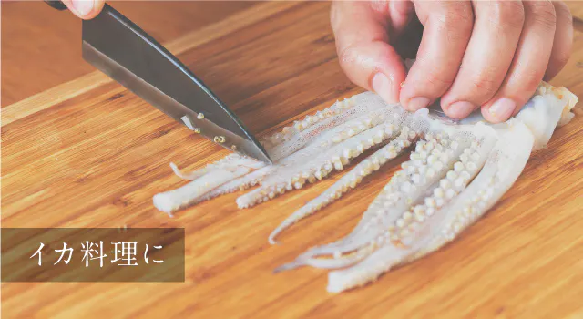 小回りが利く【SHINBU】はイカの小さな口に包丁の刃が入れやすく、イカの胴を開く時も刃がスッと入りまっすぐ綺麗にカット。