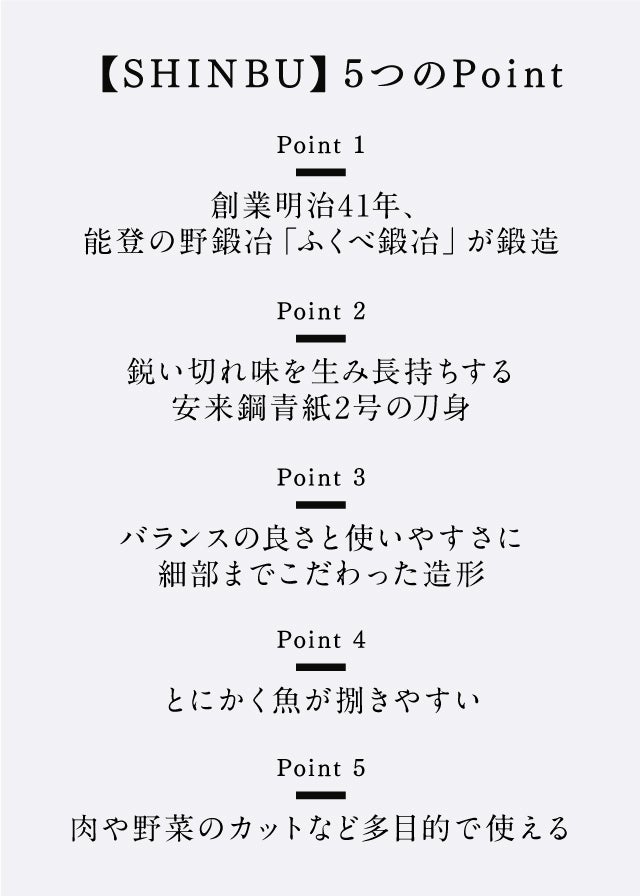【SHINBU】はNHKの番組『世界は欲しいモノにあふれている ~旅するバイヤー 極上リスト~』でも紹介された、能登の野鍛冶“ふくべ鍛冶”が鍛造した万能出刃包丁です。