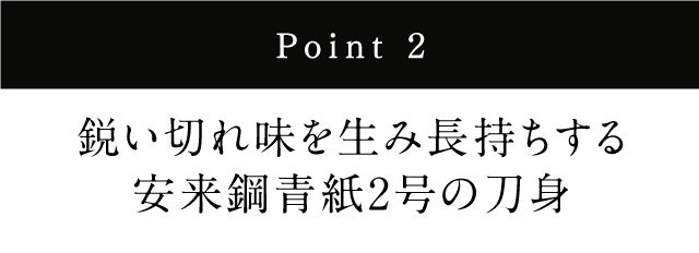 ②刃金にタフで切れ味が持続する安来鋼青紙2号を採用。地金に錆びにくくメンテナンスも楽なステンレス