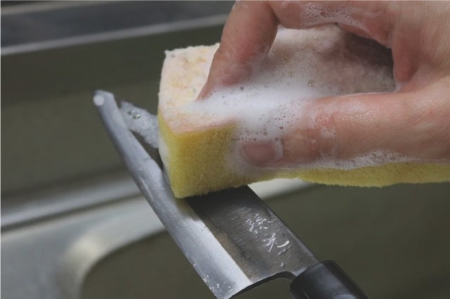 A. ご使用後は柔らかいスポンジに台所中性洗剤をつけて洗い、水分を拭き取り包丁の切っ先を下にして保管してください。長時間使用しない場合は同梱されている錆防止紙や新聞紙等にくるみ、湿気のない場所に保管します。