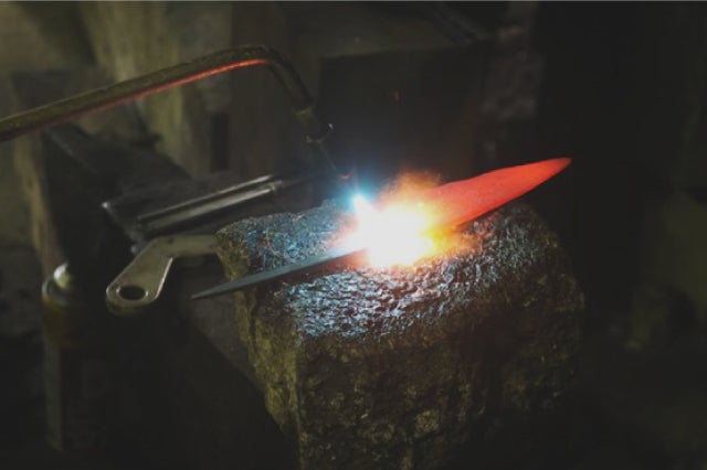 刃金の青紙2号は焼きなましで硬度が増し、切れ味が向上する性質があり、【SHINBU】では1000℃以上もの炉と自由鍛造で1本1本丹念に鍛え上げ、切れ味鋭い包丁に仕立てています。