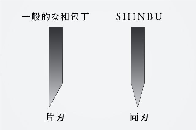 実は【SHINBU】はイカや魚の腹を素早く綺麗に開くため、刃の左右が同じ形の「両刃」造り。