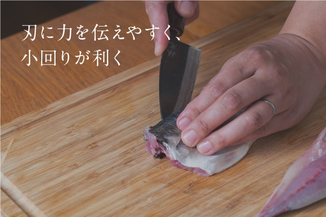 刀身が厚く短いため重心が手元に近く、手首のスナップが利きやすい構造で、軽い力でも魚が捌け、刃先を立てて魚の背骨や硬いカボチャも簡単に断ち切れます。