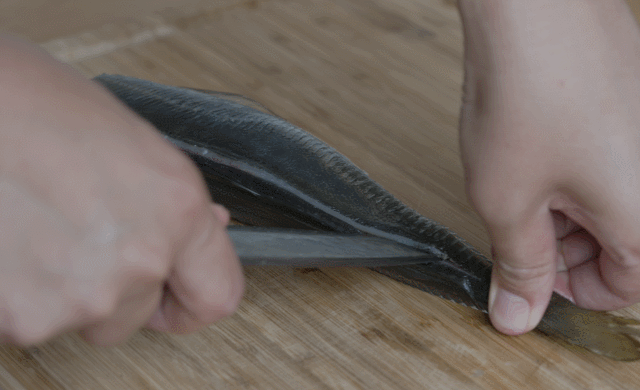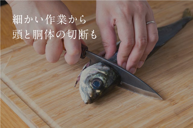 三徳包丁と違い刀身が短く、左右の利き手を問わず手首にスナップを利かせて引けば、誰でも簡単に魚の身を真っすぐ捌けます。