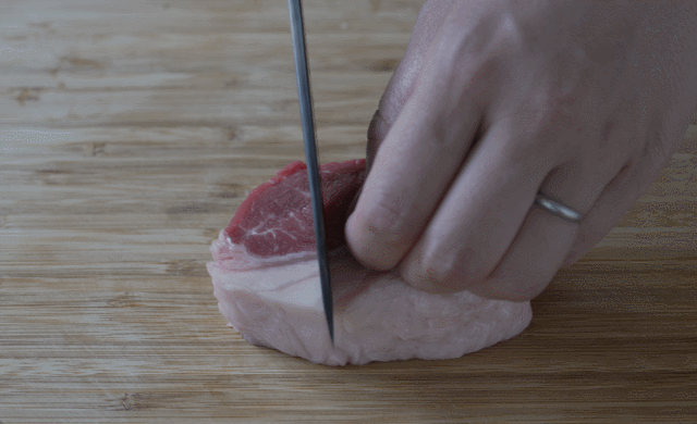 鋭い切っ先で肉の塊の筋をスパッと断ち切ります。