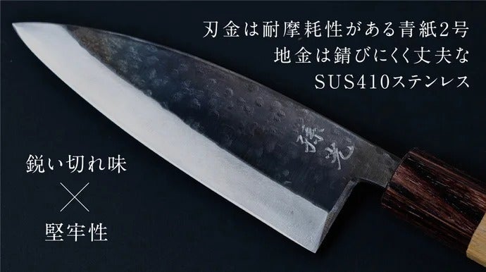 硬いステンレス鋼は骨などに当たると衝撃で刃こぼれしやすいのですが、粘りのある青紙2号は刃こぼれしにくいです。