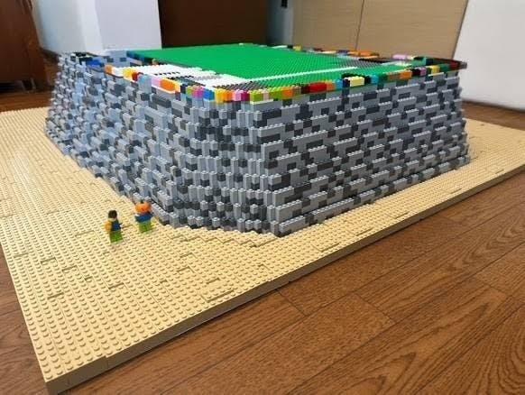 ブロック安土城の石垣部分が出来てきました!今回の講師「まっこん」が製作を着々と進めています!子どもたちには石垣から上の部分を作ってもらいます!