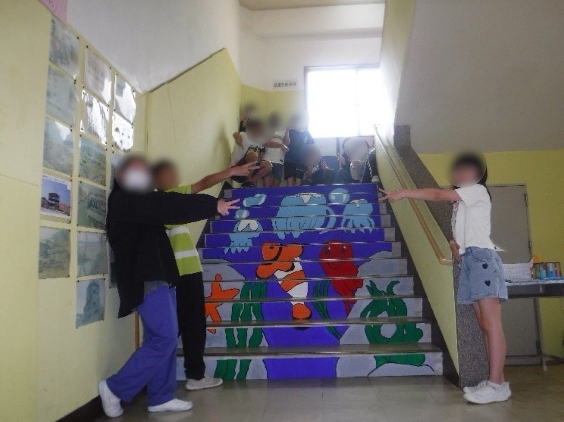 各学年や児童会でアイディアを出し合い計画を進めていますが、その第一弾として6年生が体育館側の一階階段を階段アートで飾りつけました。