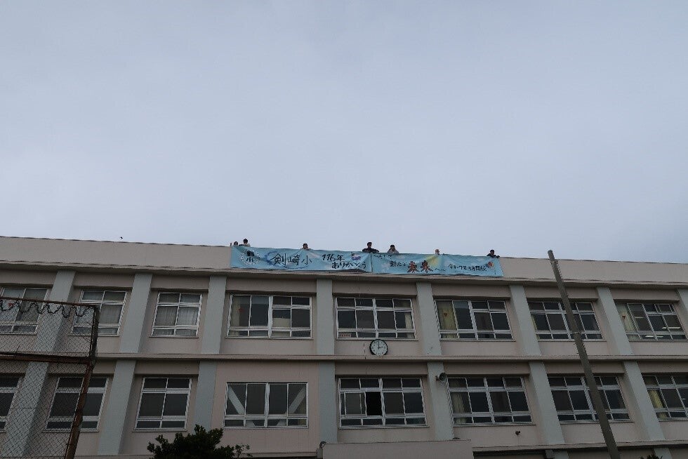 保護者、職員、児童の合作による、これまでの感謝と子どもたちの未来に願いを込めたスローガン「剣崎小 116年ありがとう~そして新たな未来へ~」の横断幕が完成し、朝会でお披露目しました。