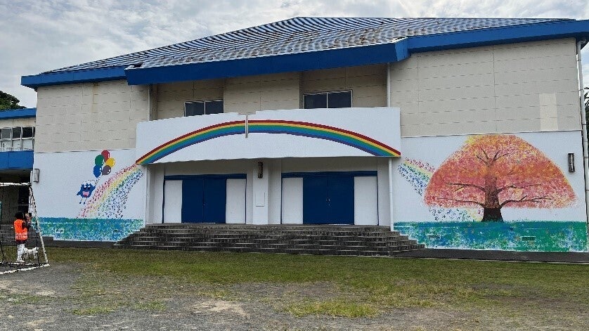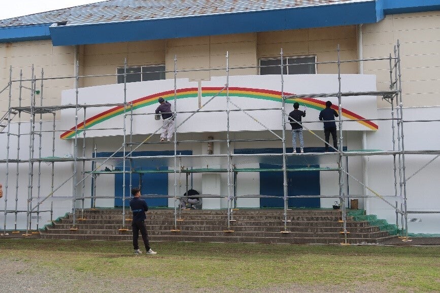 三浦塗装工業組合のご厚意により体育館の校庭側壁面を白く塗装したうえに、バルコニー壁面に記念に残る虹を描いていただきました。