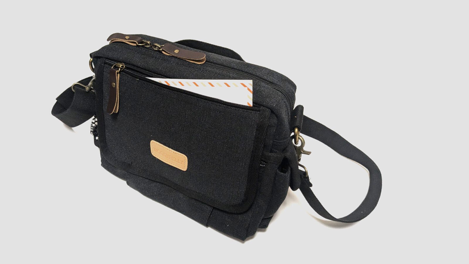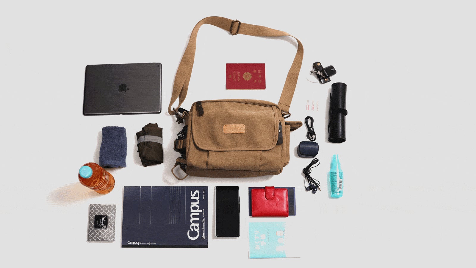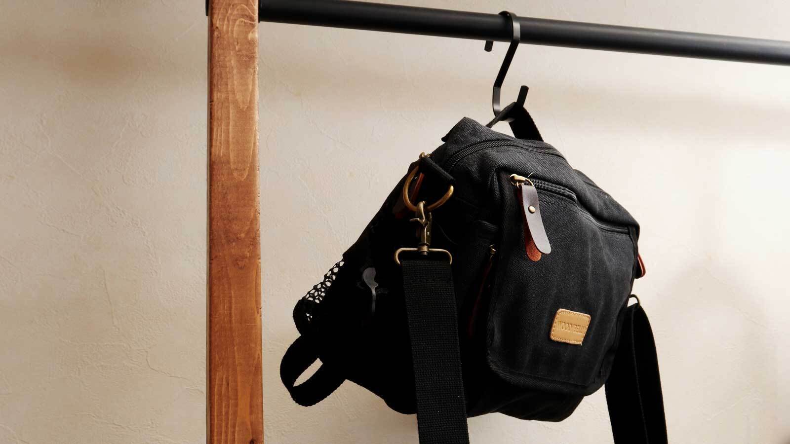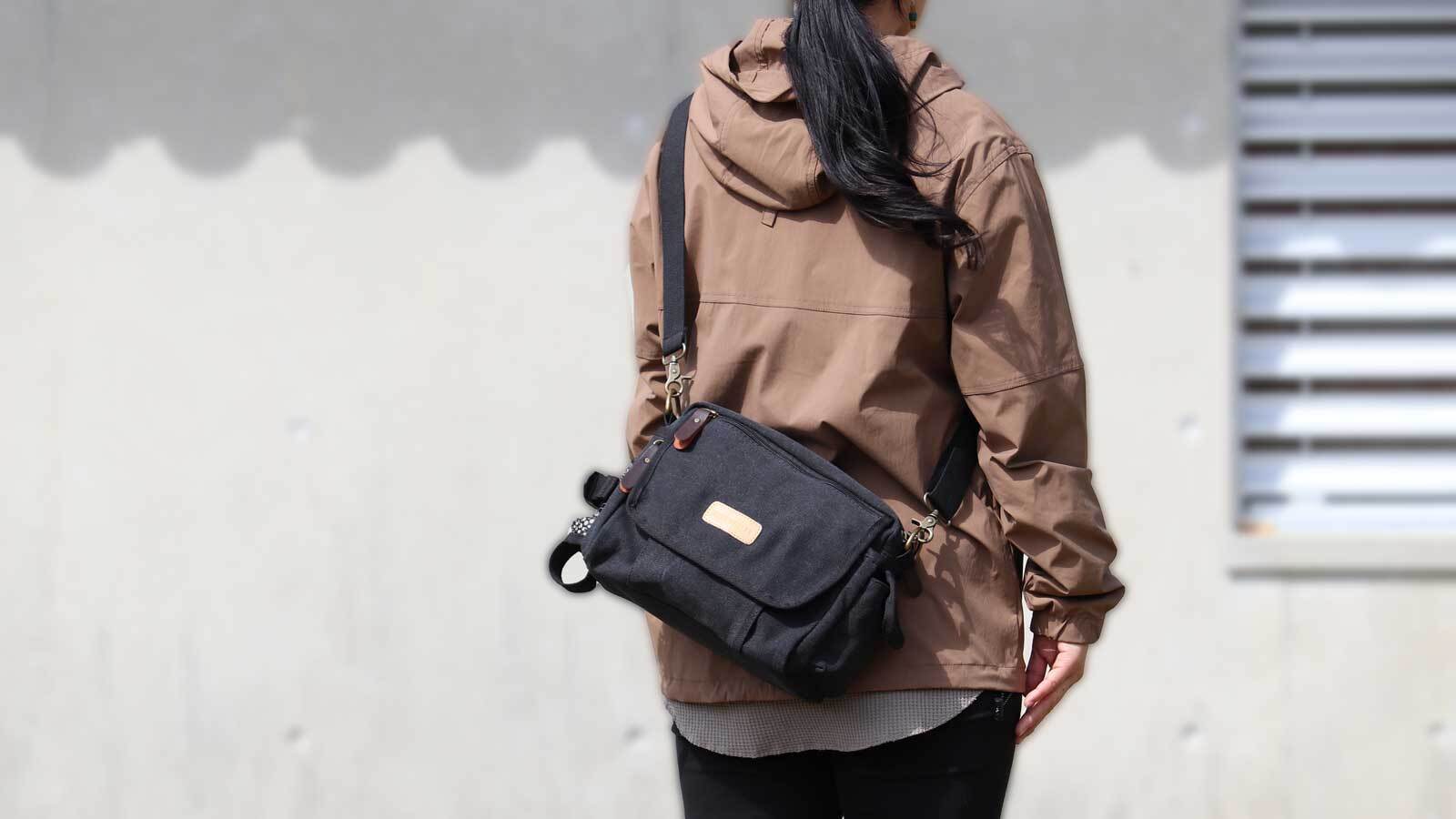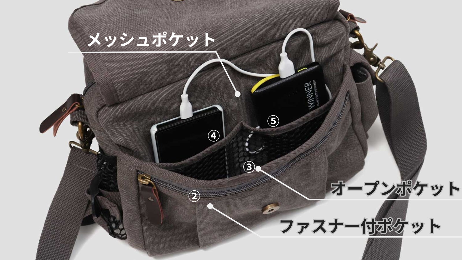 スマホ・ガジェットに即アクセス。分別整頓できる4層構造!軽量帆布ショルダーバッグ