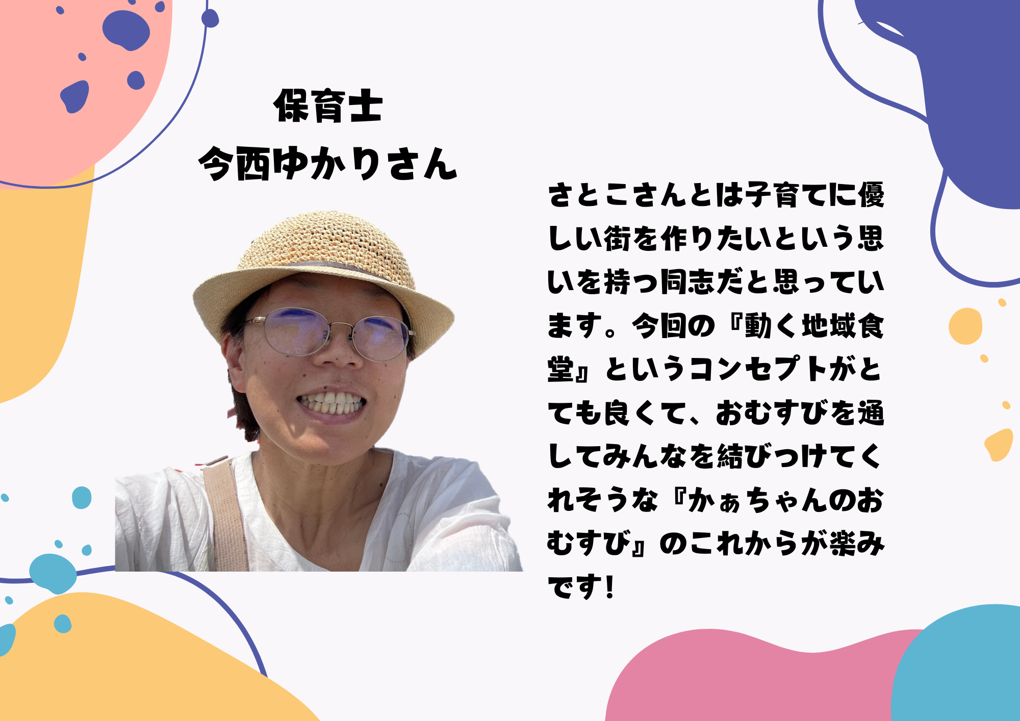 2024/10/07 00:45保育士の今西ゆかりさんより温かい応援メッセージをいただきました。ゆかりさんとは、同じ地域で子育てをする母親としての繋がりもあり、楽しいイベントも企画され、先日は〝親子で握ろうおむすび企画〟としてマルシェにお誘いいただき、開催させていただきました。人と人を繋いで下さるとても温かい方です。いつも、有り難う御座います。 もっと見る