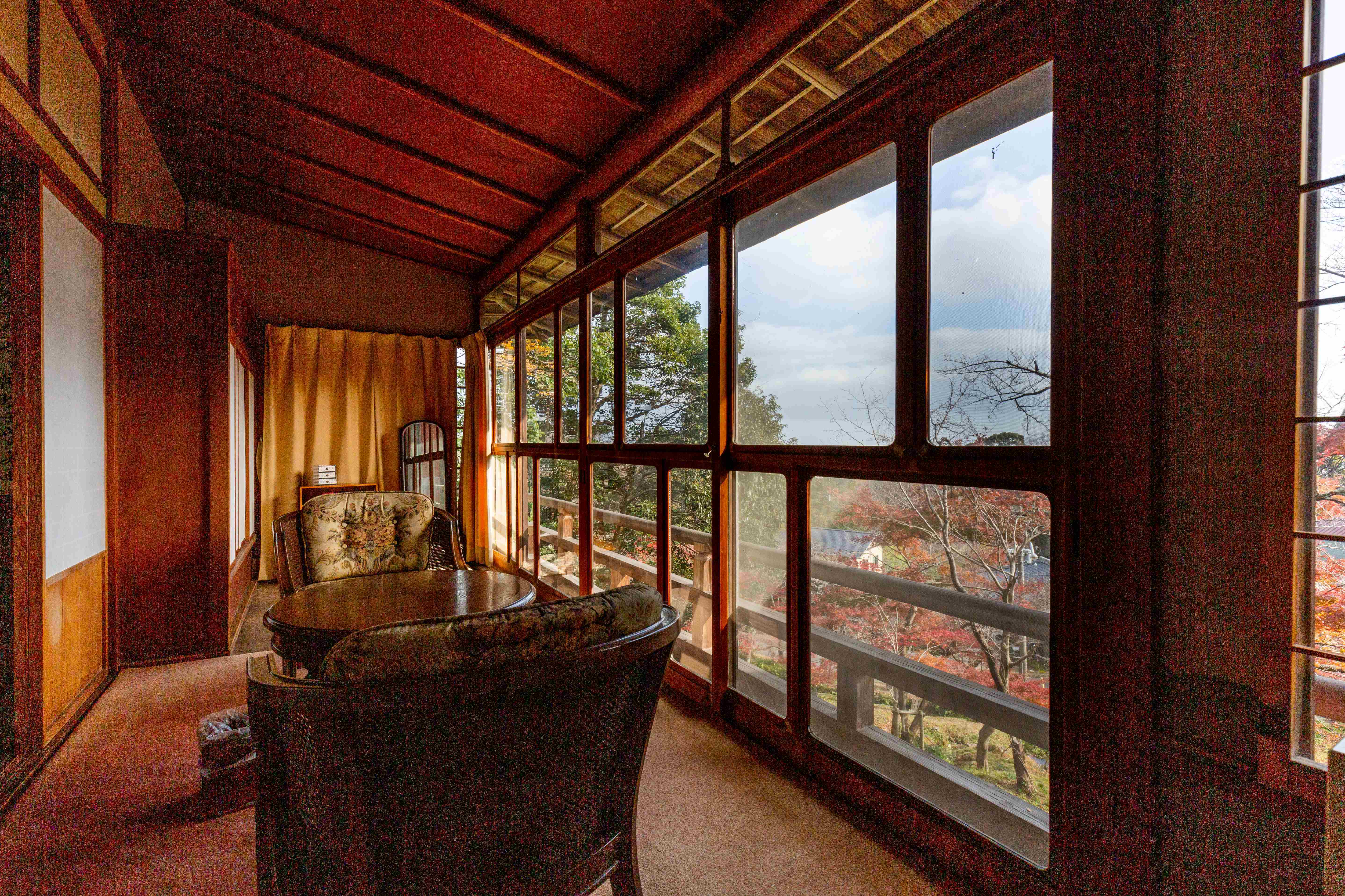 <松の間の縁側 奥のカーテンの向こう側にお風呂棟を増設します この縁側から見える景色を、檜風呂にゆっくり浸かっていただきながらご覧ください>