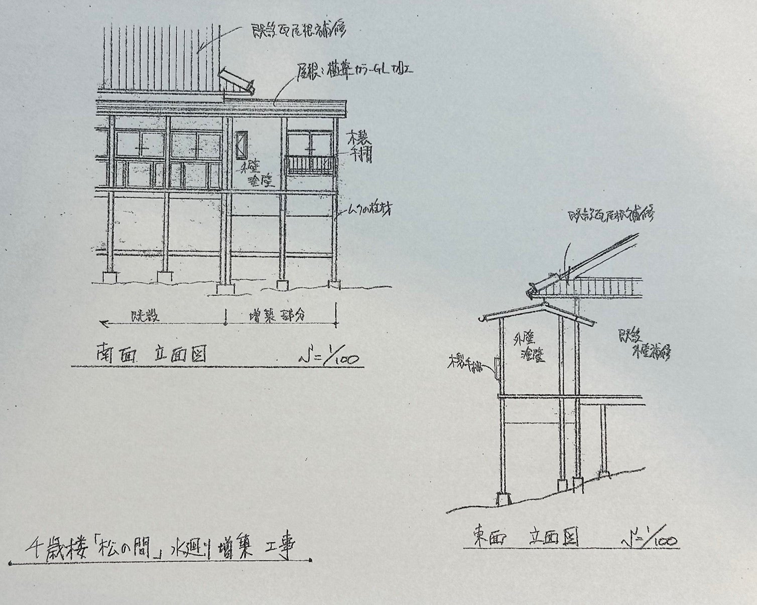 千歳楼は国登録有形文化財ですので外観の改修工事には認可が必要です。また千歳楼は国定公園の中にあるため岐阜県から増築する分の土地を新たに借りる契約が必要となり、現在これらの交渉がほぼ完了し工事の準備が整いました。