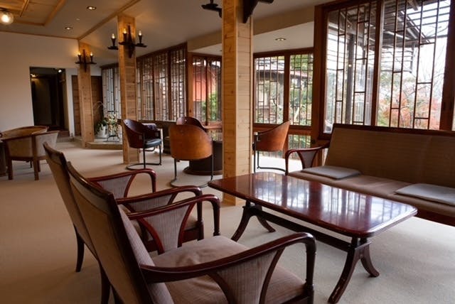 <画家河合五郎太デザイン(竹の節を模した窓ガラス)のロビーでゆっくりお寛ぎください>