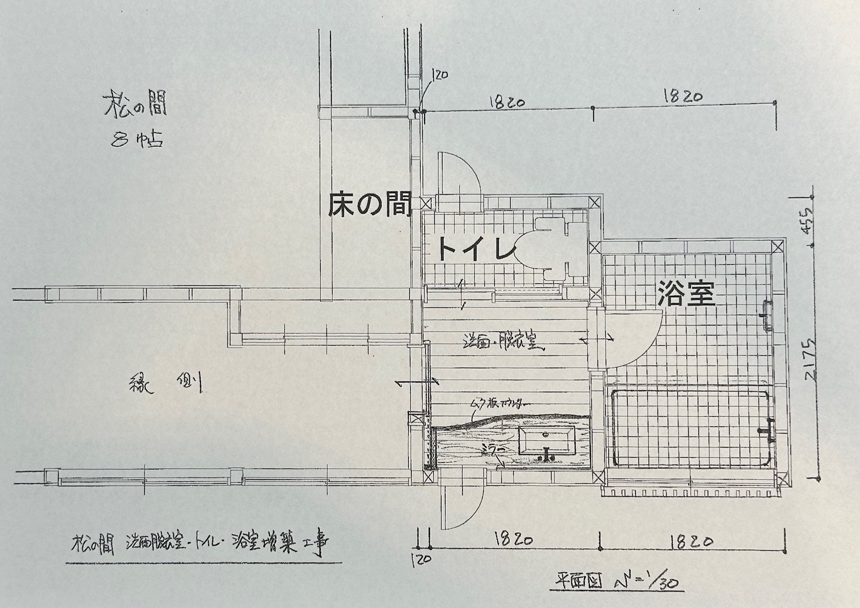 <松の間の新しいお風呂場の図面です トイレと洗面所も併設します>