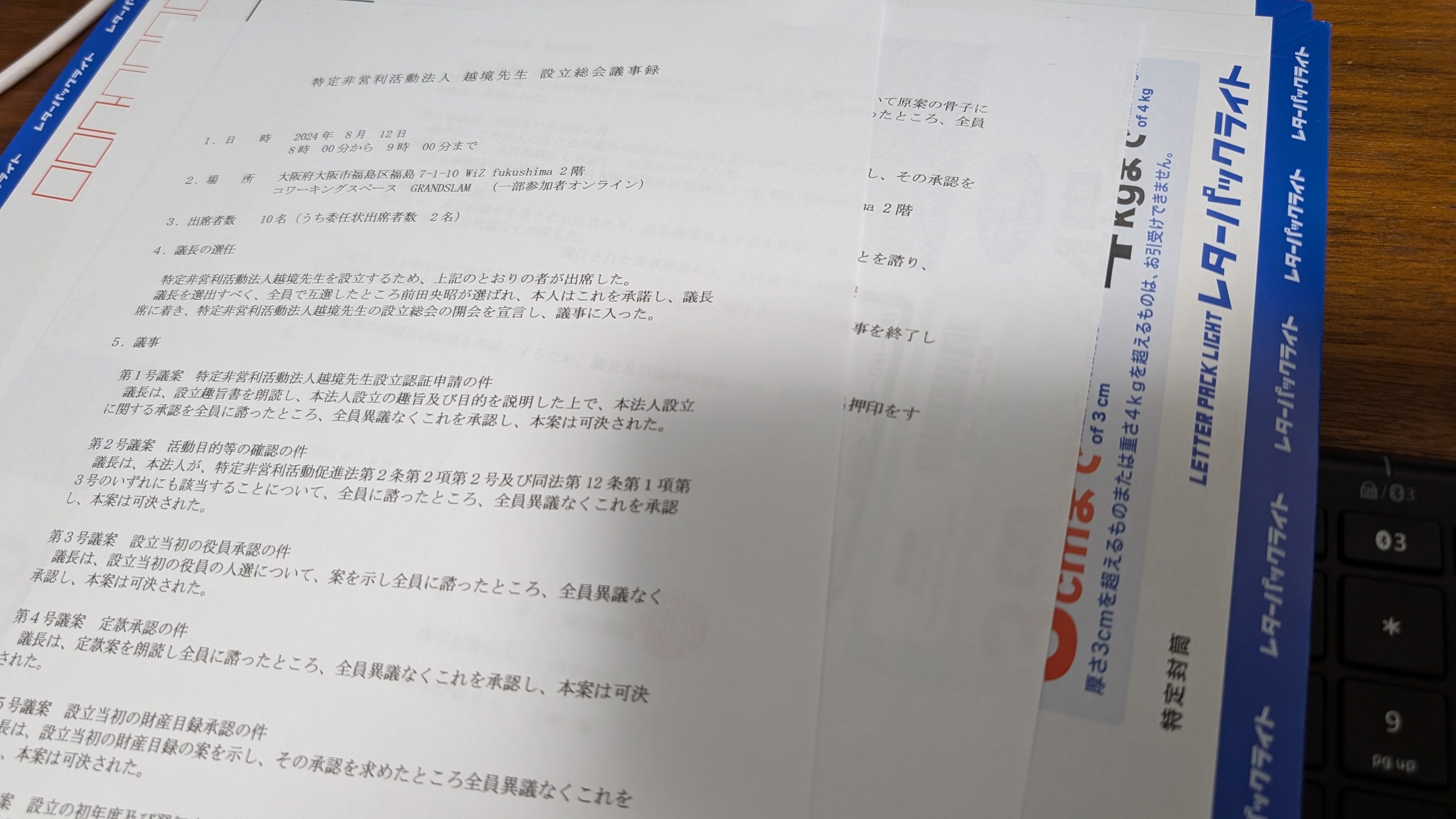 教員の複業を含む越境を支援するための法人「越境先生」の法人登記作業の進捗をご報告します。