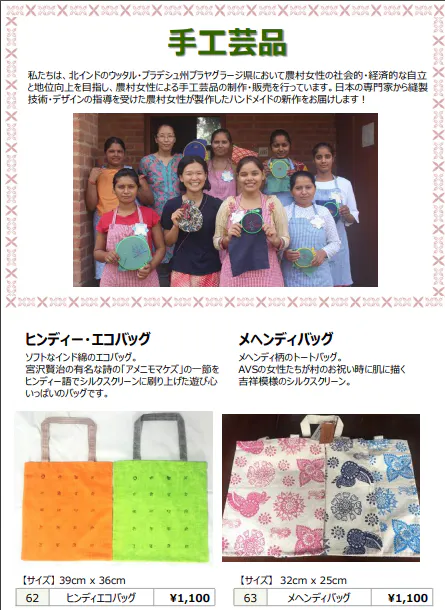 ③プロジェクト終了後に、農村女性NGO(AVS)カタログのリンクをメールいたしますので、¥10,000までの商品を選び、メールに返信する形でお知らせください。