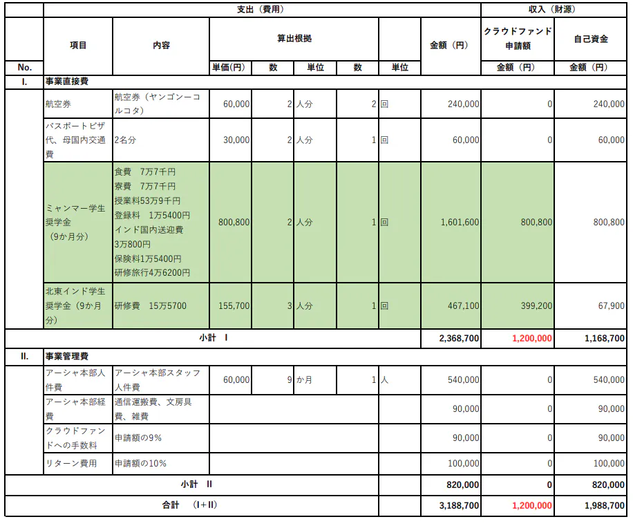 『持続可能な農業・農村開発コース』のため(ミャンマー人研修生2名と北東インド研修生3名)の全費用は以下のようになります。2024年5月の時点で、ミャンマーからは2名の研修生のコース参加が見込まれています。彼らの航空券やビザ手配のための経費、アーシャ本部の人件費経費、今回のクラウドファンディング手数料やリターン費用などを含めて合計3,188,700円の資金が必要になります。このうち1,988,700円を自己資金で賄い、残りの1,200,000円をこのクラウドファンディングを通して調達したいと思います。