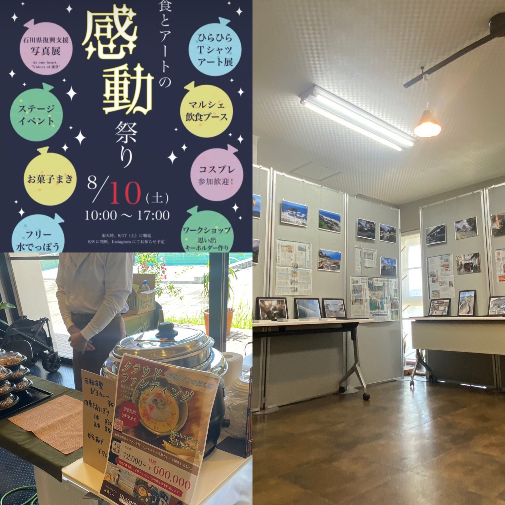 2024/08/13 20:10先日、食とアートの感動祭りというイベントに参加させていただきました。8月8日に宮崎県で地震がありその震源地の影響で南海トラフが刺激されたらしく南海トラフ地震注意報という初めて聞く注意報が発令されイベント当日には白浜の花火大会があったのですが中止が発表されその他の日時は違いますがイベントや花火大会がほぼ全て中止になりました。そんな中開催されたイベントで多くのお客様に恵まれ、実際に冷製マグロカレーを食べてもらい直接「美味しかったです」と感想を言って貰えました!すごく自信が着きまきた!そしてこのイベントには被災地能登の写真展があり、この情報はクラウドファンディングをする前から頂いており必ず見て話を聞きたいとそう思っていました。実際写真を見ただけでメディアだけでは伝えきれないほどの現地の状況がわかりました。写真を見ただけでこれだけ衝撃を受けると言うことは現地は想像もつかないくらい大変な状況であることは一目瞭然でした。担当者と少しお話し出来ましたが誰もが何から手をつけていいか分からない状態ということで少しでもなにか力になれればと思いました。 もっと見る