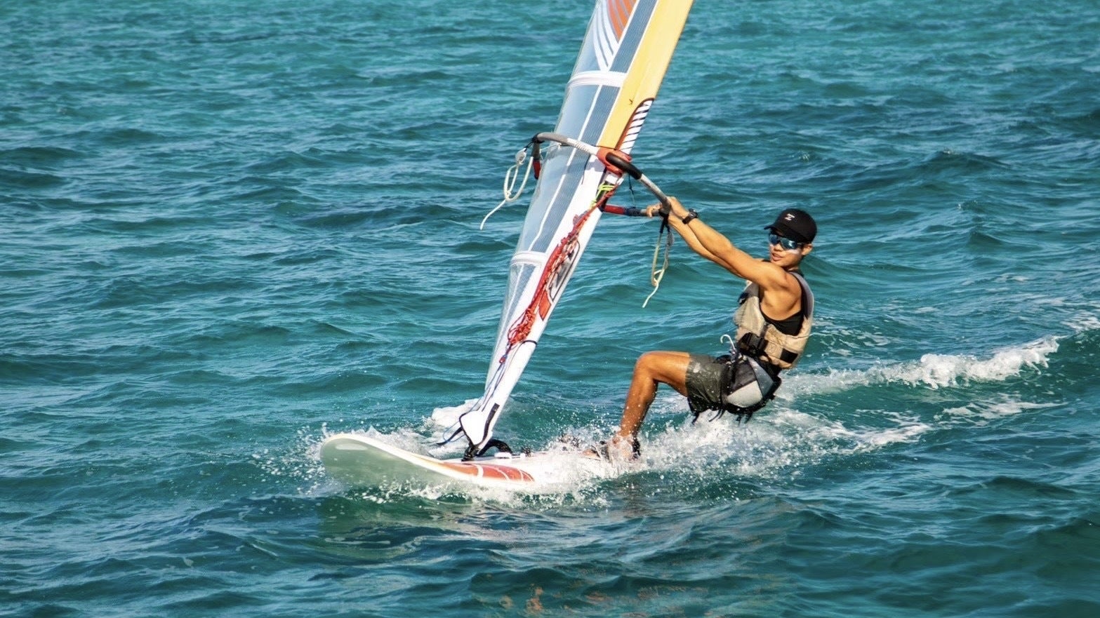 ウィンドサーフィンとは、風の力で会場を滑走するマリンスポーツです。その最高体感速度は100km/hともいわれます。