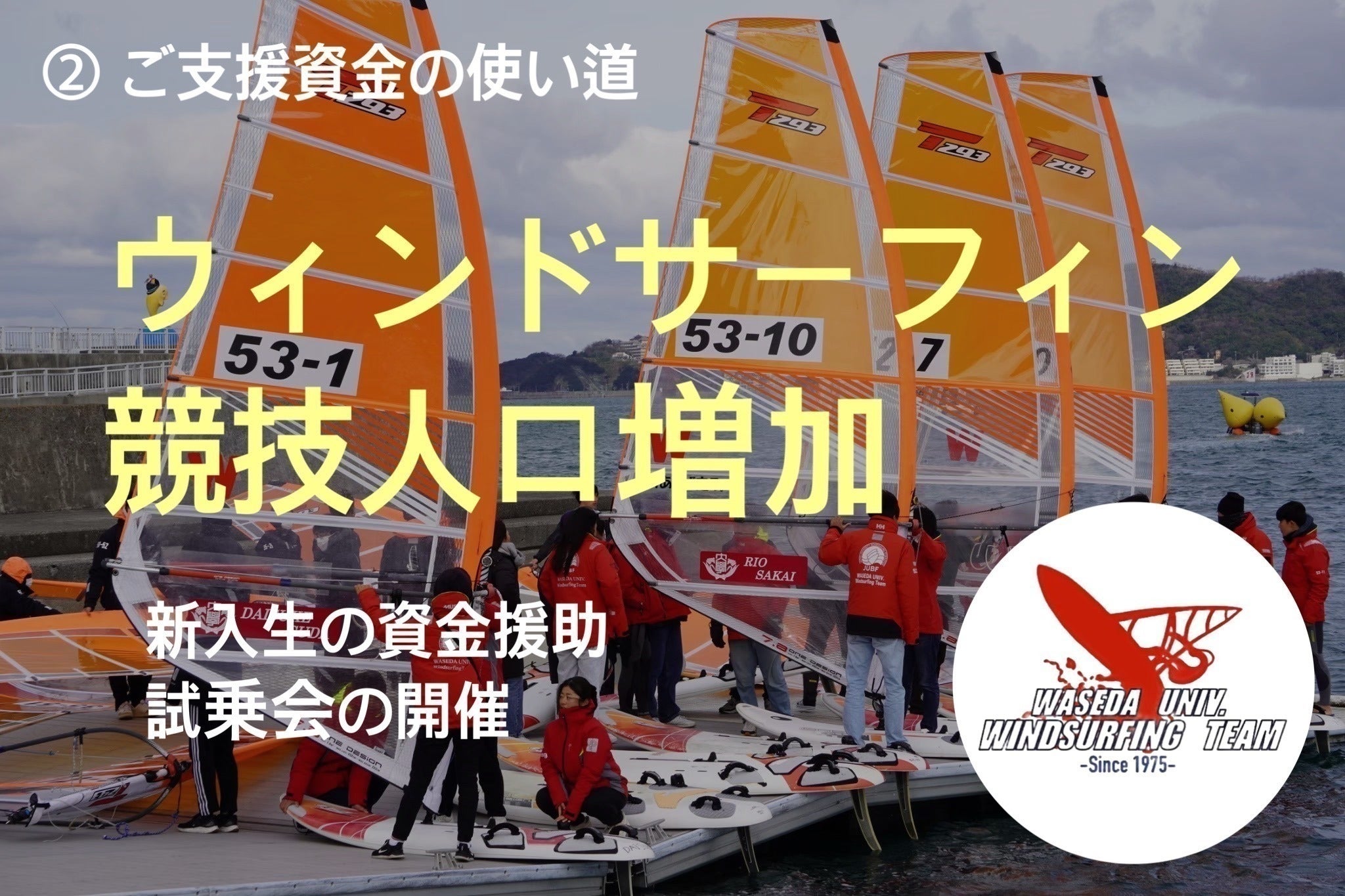 ②ウィンドサーフィンの競技人口増加 のための新入生の援助や試乗会の開催に使用します。