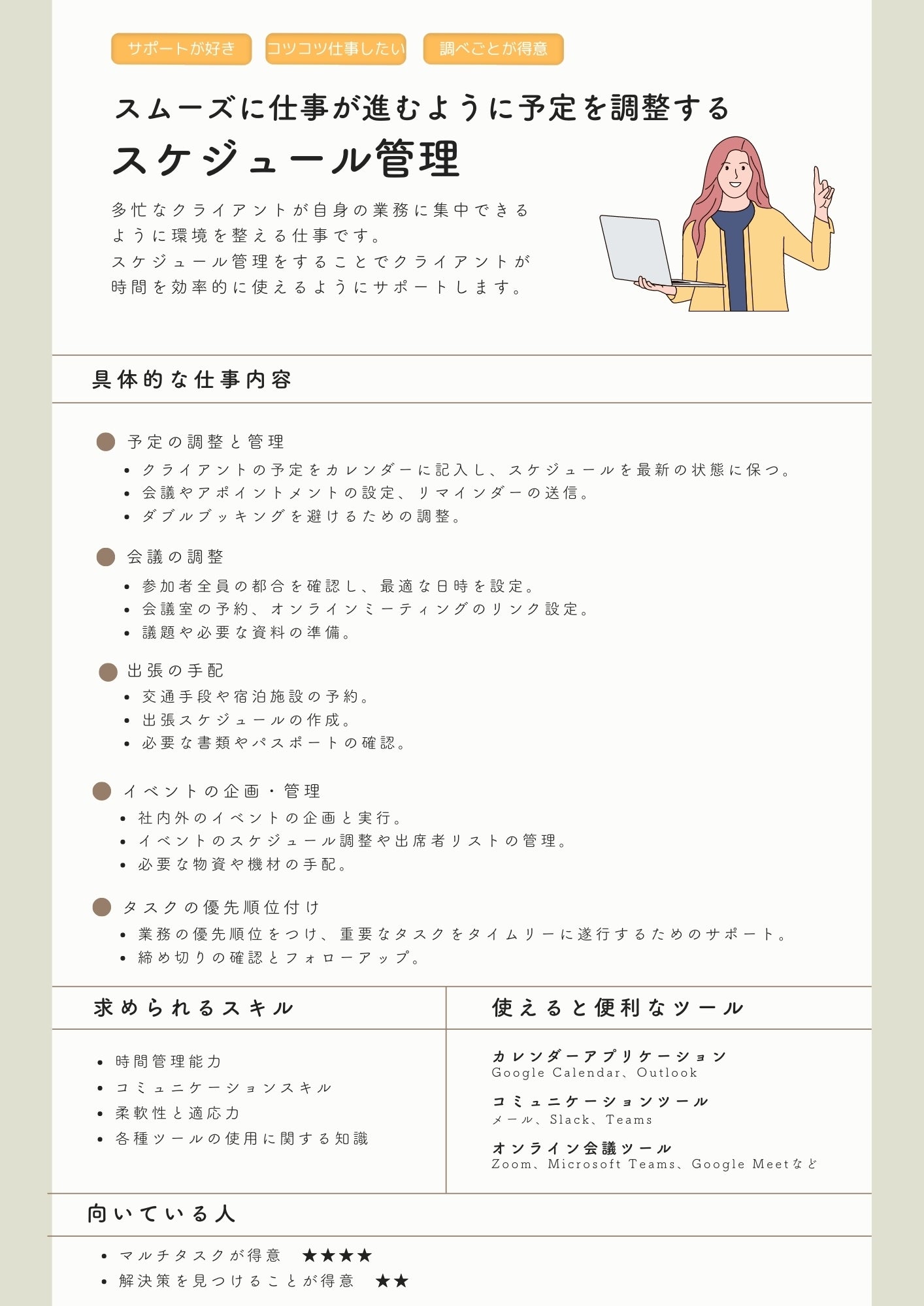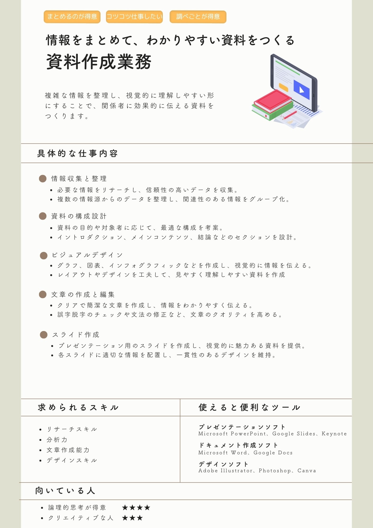 そのうえで、求められるスキルや、使えるツール、どんなタイプの人が向いているかなどを、一目で分かるようにまとめる予定です。