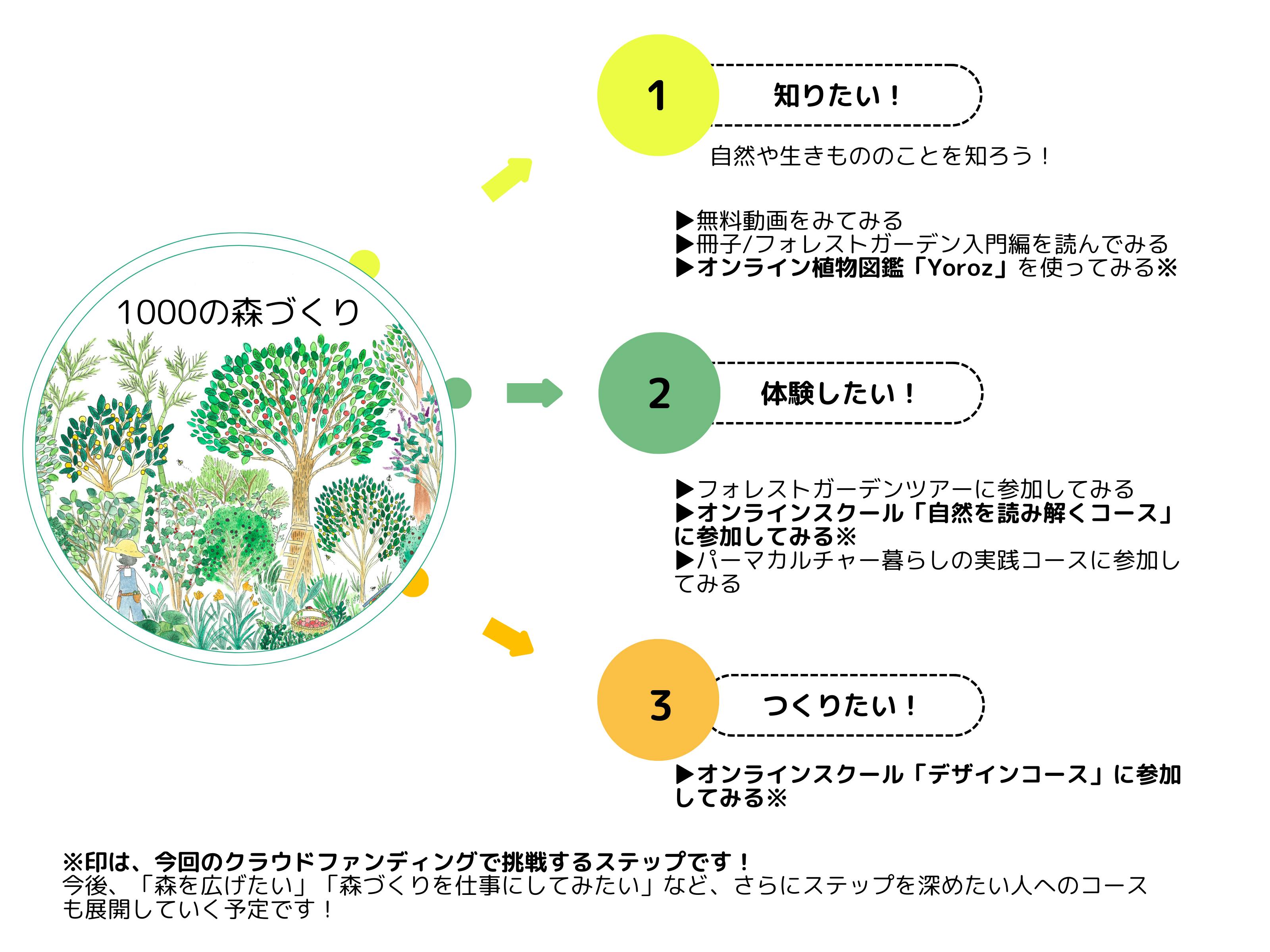 わたしたちが10年かけて培ったフォレストガーデンづくりの経験を活かし、まずは植物図鑑Yorozとオンラインスクールという場を通して、次世代へつながる1000の森づくりに挑戦します。