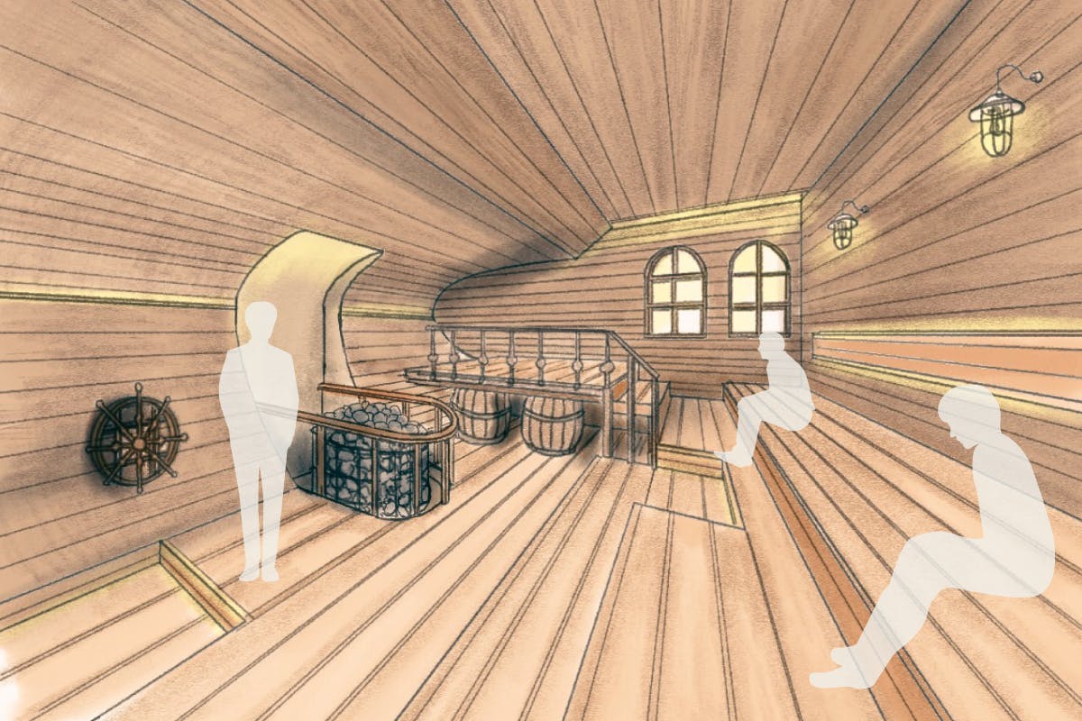 1番のこだわりは、なんといっても海賊船風のサウナ室!