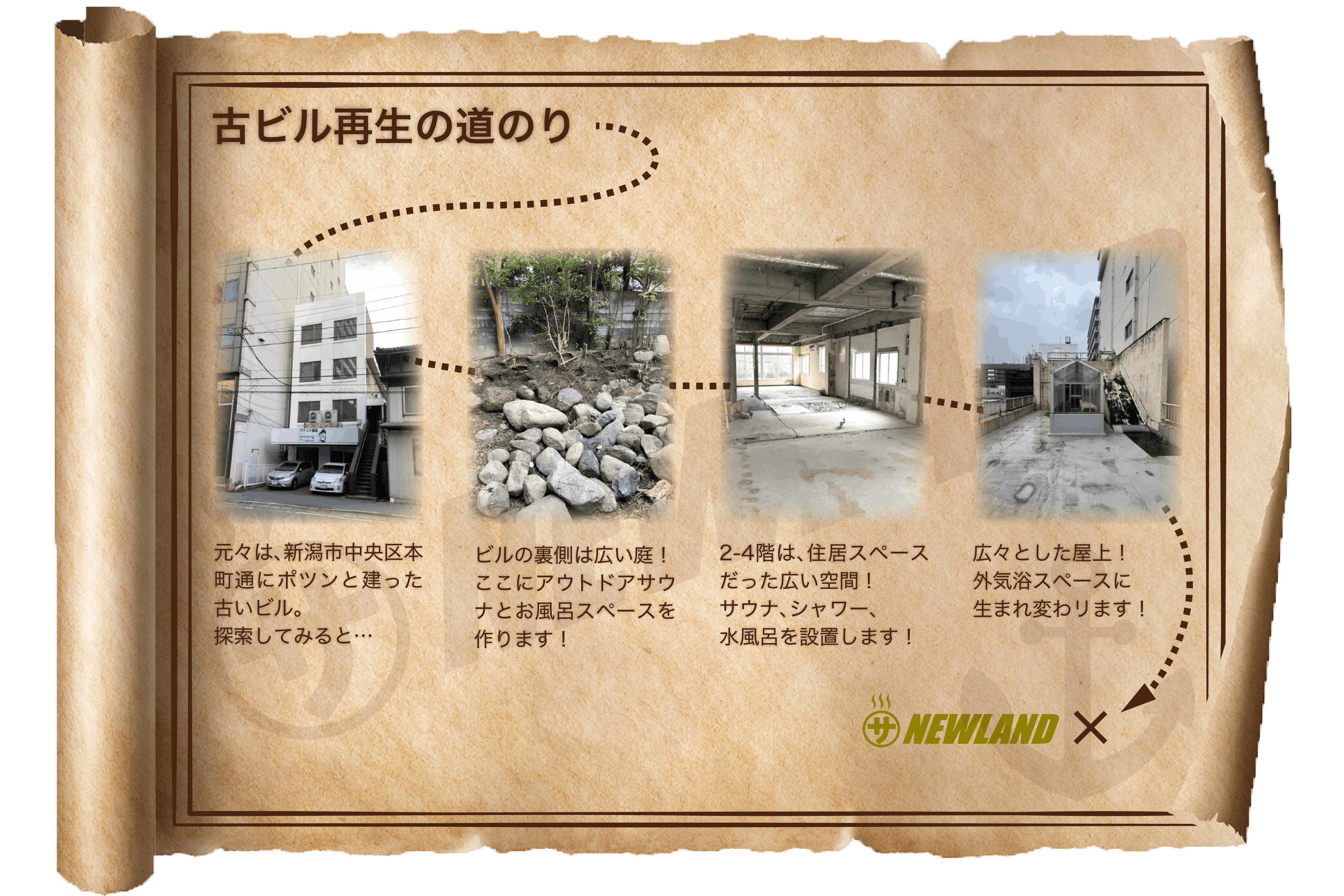 サウナNEWLAND新潟は、新潟市の中心部にある4F建ての古ビルを自分達で改装しながら作っています。
