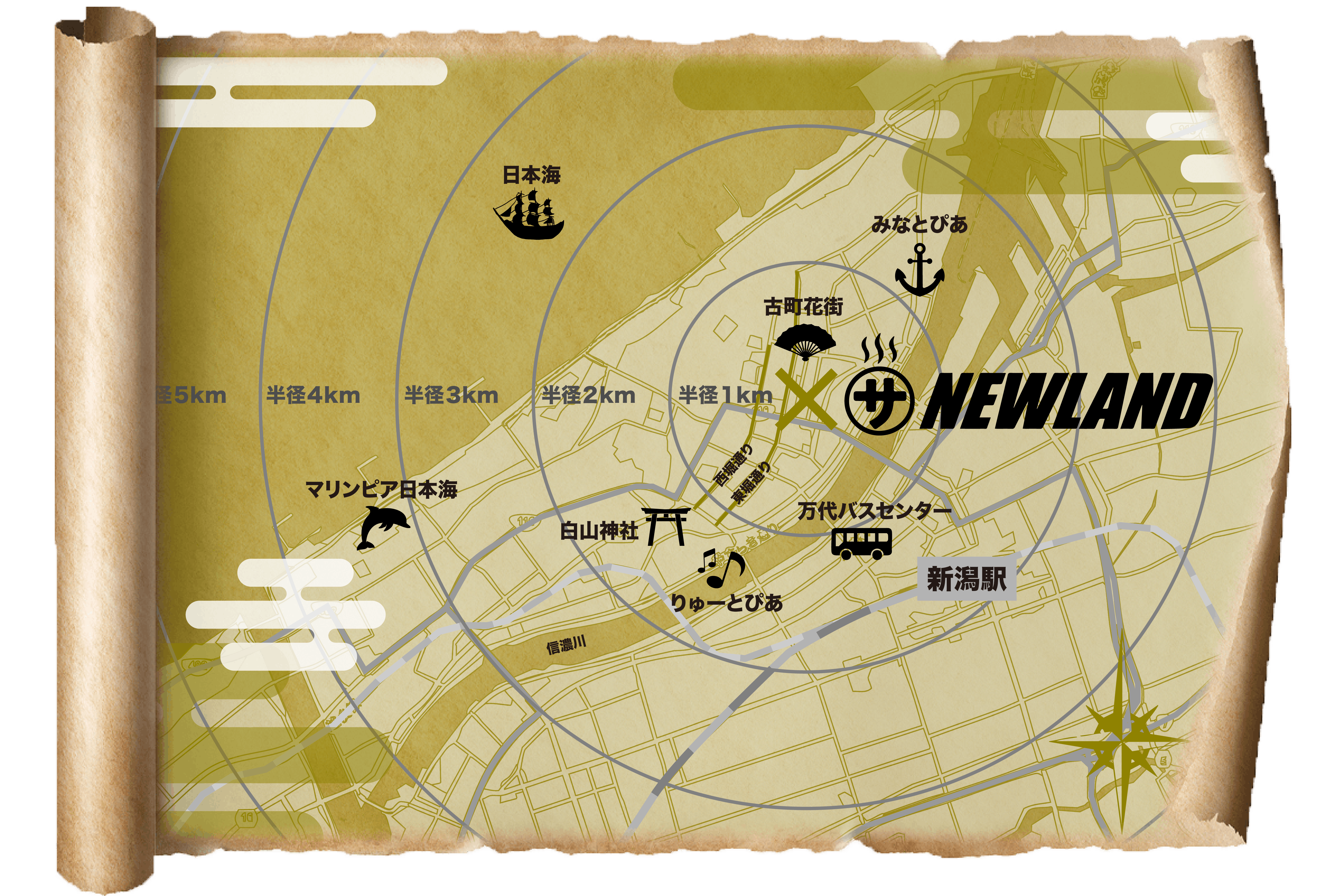 サウナNEWLAND新潟は歴史と文化のある港町、新潟古町エリアに位置しています。