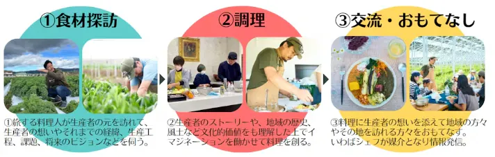 旅するシェフが地方を訪れて出会う食材だけでなく、地域に住まわれている方々やその地域を訪れる人々に対して一期一会の「食」体験を提供する。生産者やその地域の歴史に想いを馳せて食事をすることで “心を満たすこと” にもつながると信じています。
