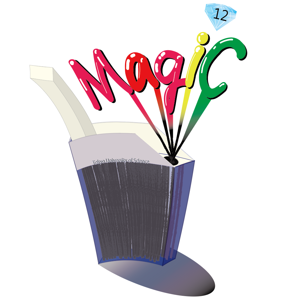 をテーマに掲げ、準備を進めています。このテーマには12回目の開催に際して、原子量約12の炭素の元素記号「C」と原子番号12のマグネシウムの元素記号「Mg」の文字が含まれており、「C」は現代社会の主役であり、「Mg」は激しく燃焼する性質を持っています。このことから、誰もが激しい燃焼のように楽しく、地域にとって重要な学園祭となるような願いを込めています!また、テーマ全体の文字「MagiC^12」は学生だけでなくお客様も主役として楽しめるマジックがかかったような学園祭となるような意味を込めています!以下のイラストは今年度の葛飾地区理大祭のロゴデザインです。