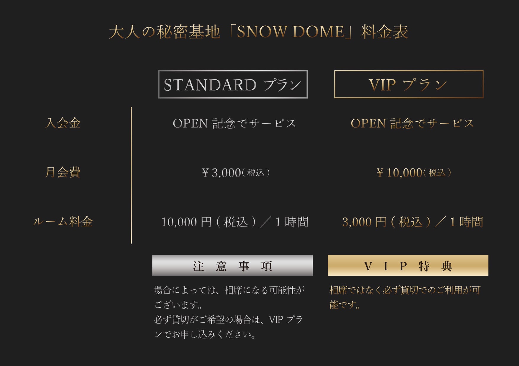 大人の秘密基地「SNOW DOME」料金表