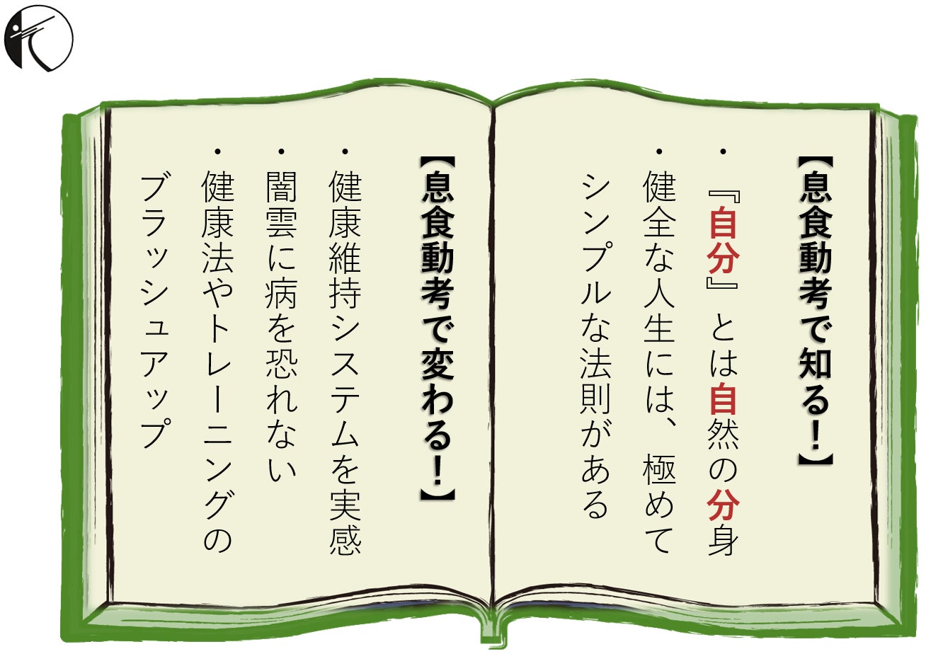 世界中の誰もが体内に持つ健康維持システムをより良く機能させる生き方・考え方。それが、古くて新しい先人の教え【息食動考(しき・しょく・どう・こう)】です。書籍には『今すぐ始められる健康術』『やみくもに病を恐れなくなる食ベ方』『情報に振り回されない強い心の作り方』など、87個の面白健康人生訓として掲載。「自然の分身としての《自分》」を取り戻す人生のガイドブックに仕上がりました。