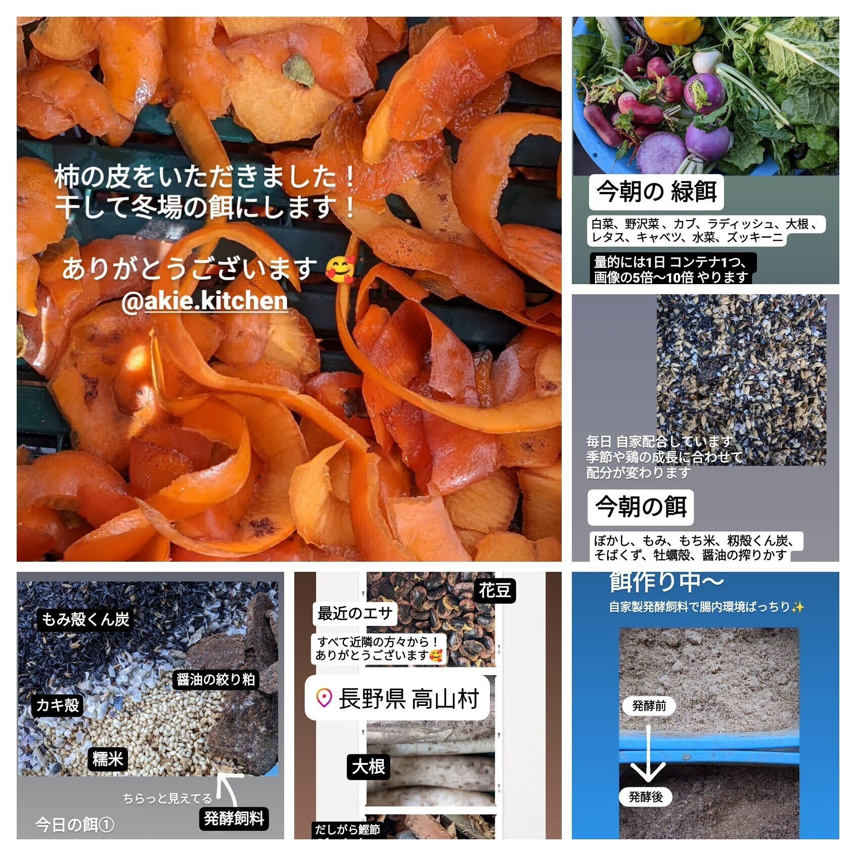 まずはエサ。むらたまの方針は、地域の未利用資源を活用した自家配合飼料です。広島産カキ殻以外、すべて地域から集めたもの。米ヌカ、くず米などの穀類、たんぱく源のカツオ節(そばつゆの出汁がら)や豆類、そして菜っ葉などの野菜、果物。クラフトビールの搾り粕や豆腐屋さんからのおから。塩分には味噌屋さんからの醤油の搾り粕。水も高山村の湧き水(藤田屋酒店さんご提供)。