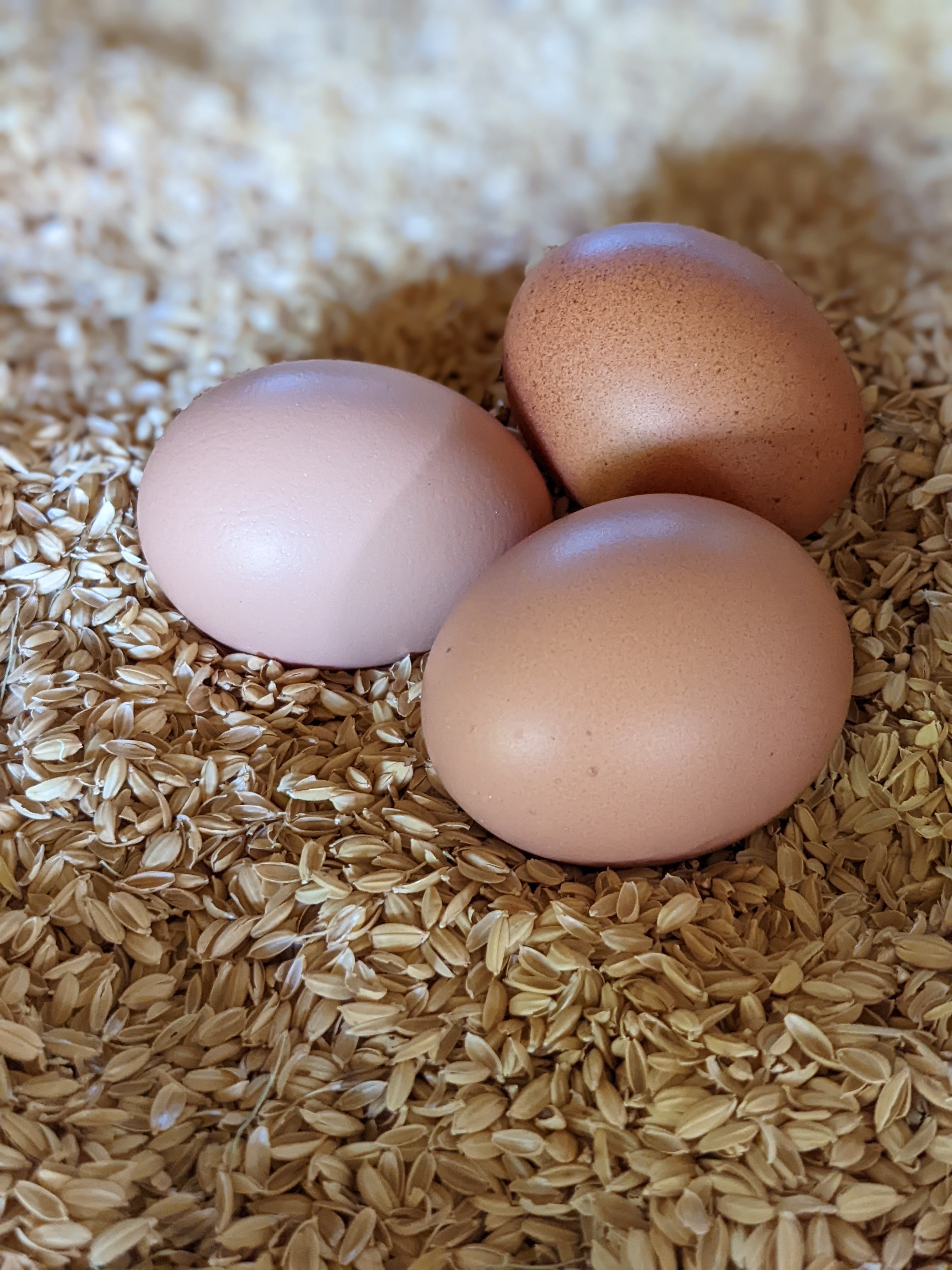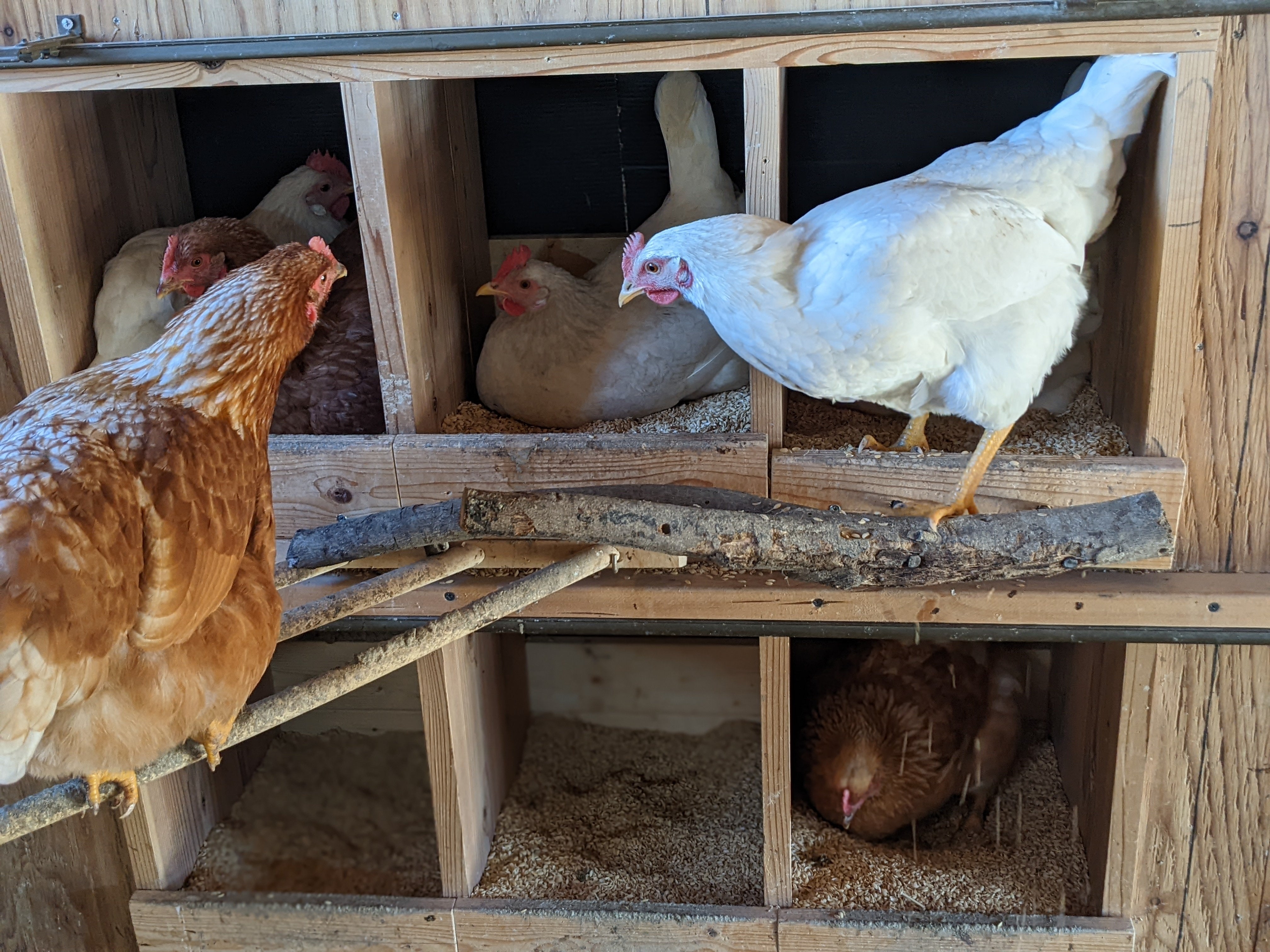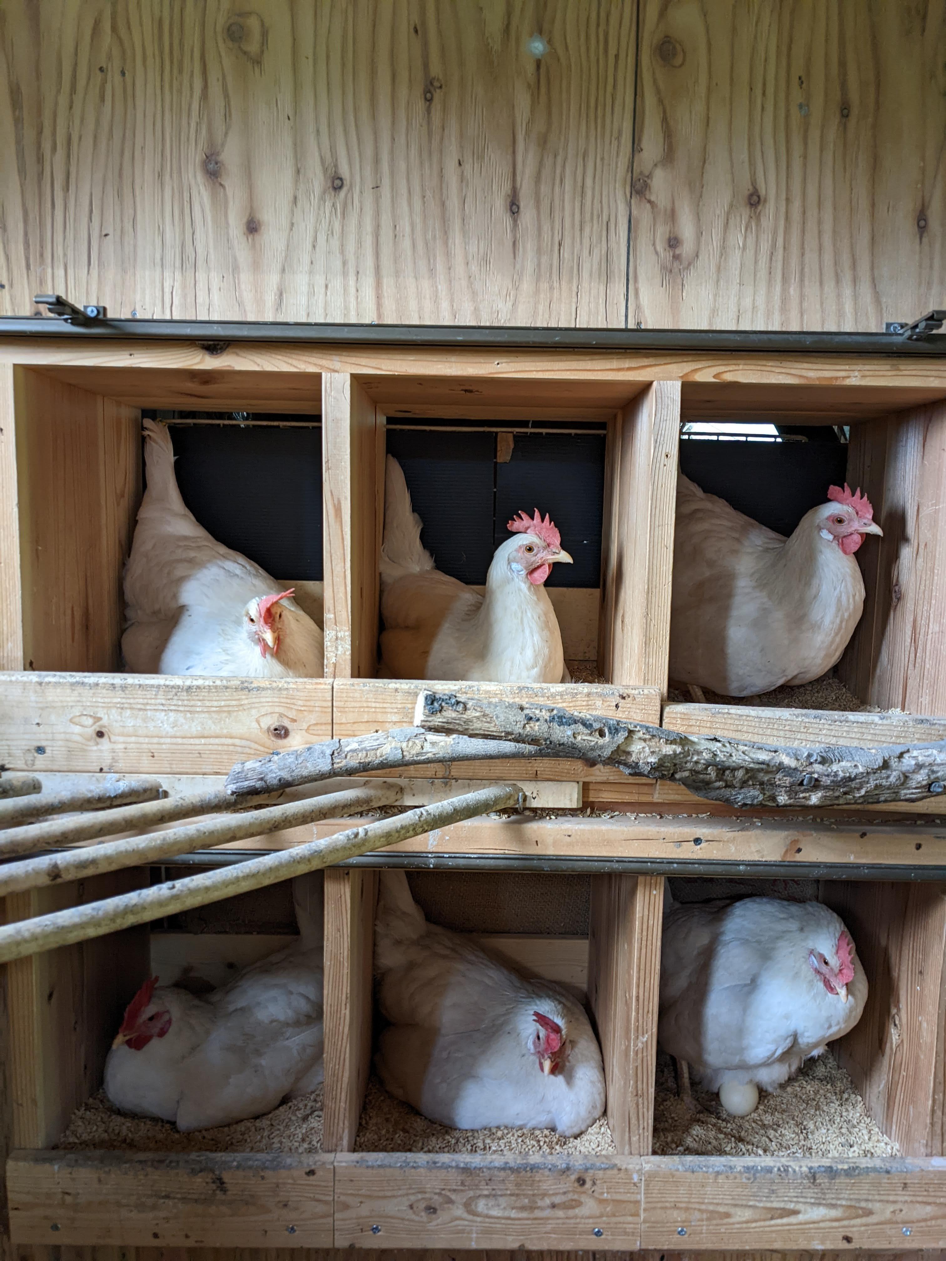 鶏の行動を見ていると、(だれかが産んだ)卵がある産卵箱を好んで選んでいます。空っぽの産卵箱はずっとそのまま、どこか1カ所だけ大人気!ということが起きます。みんな卵を胸元に集めて、温めながら産みたいのです。