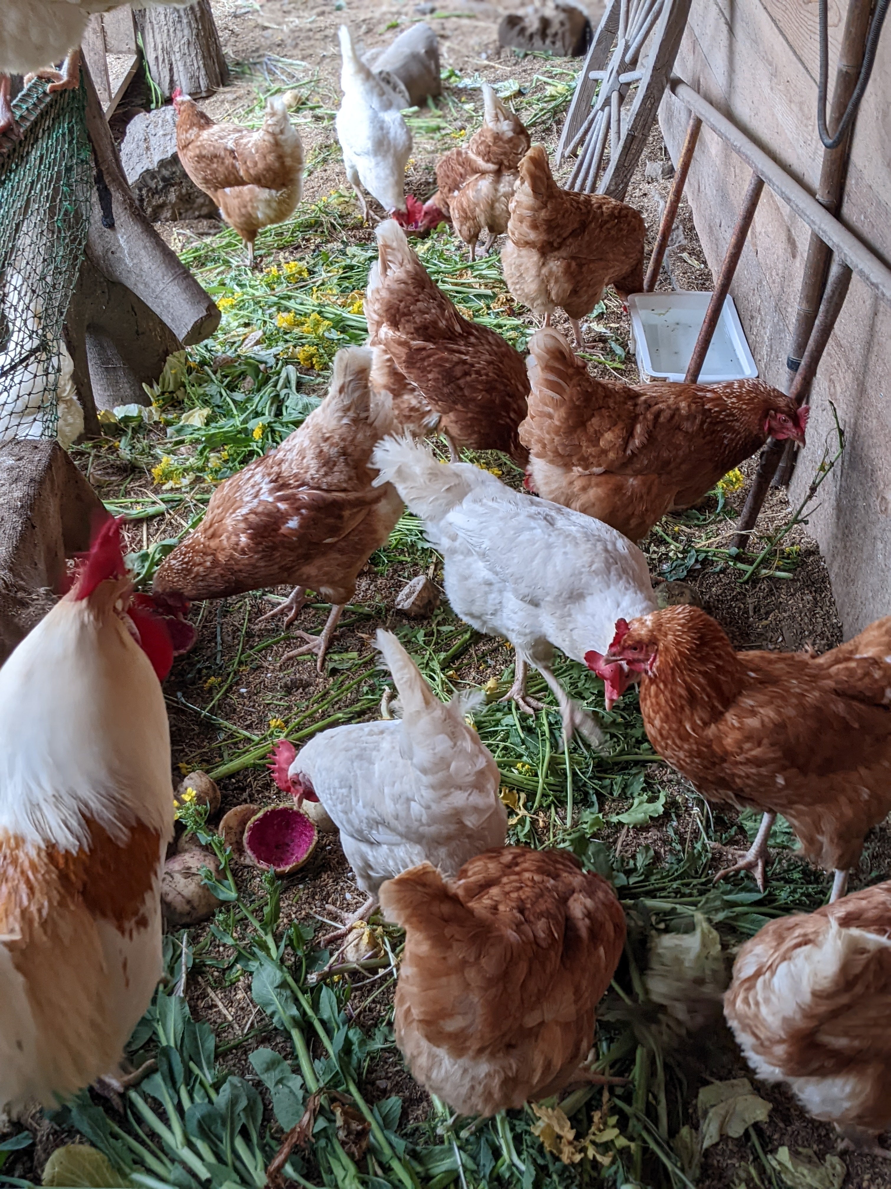 米ヌカは発酵させ、豆やジャガイモは生だと毒性があるので火を通し、ヒナには野菜を刻んで与える等々、手間がかかります。市販の配合飼料なら簡単なのですが。