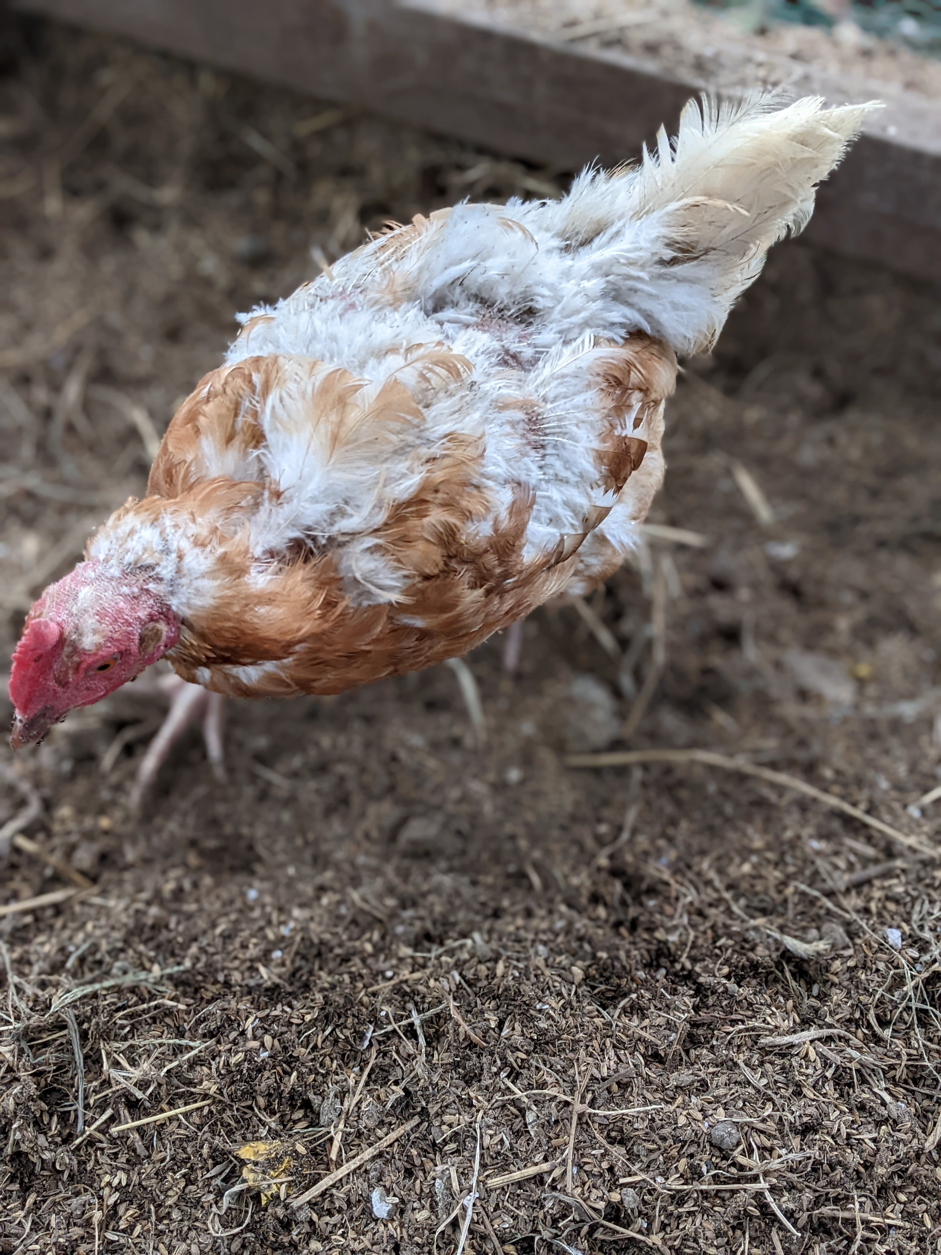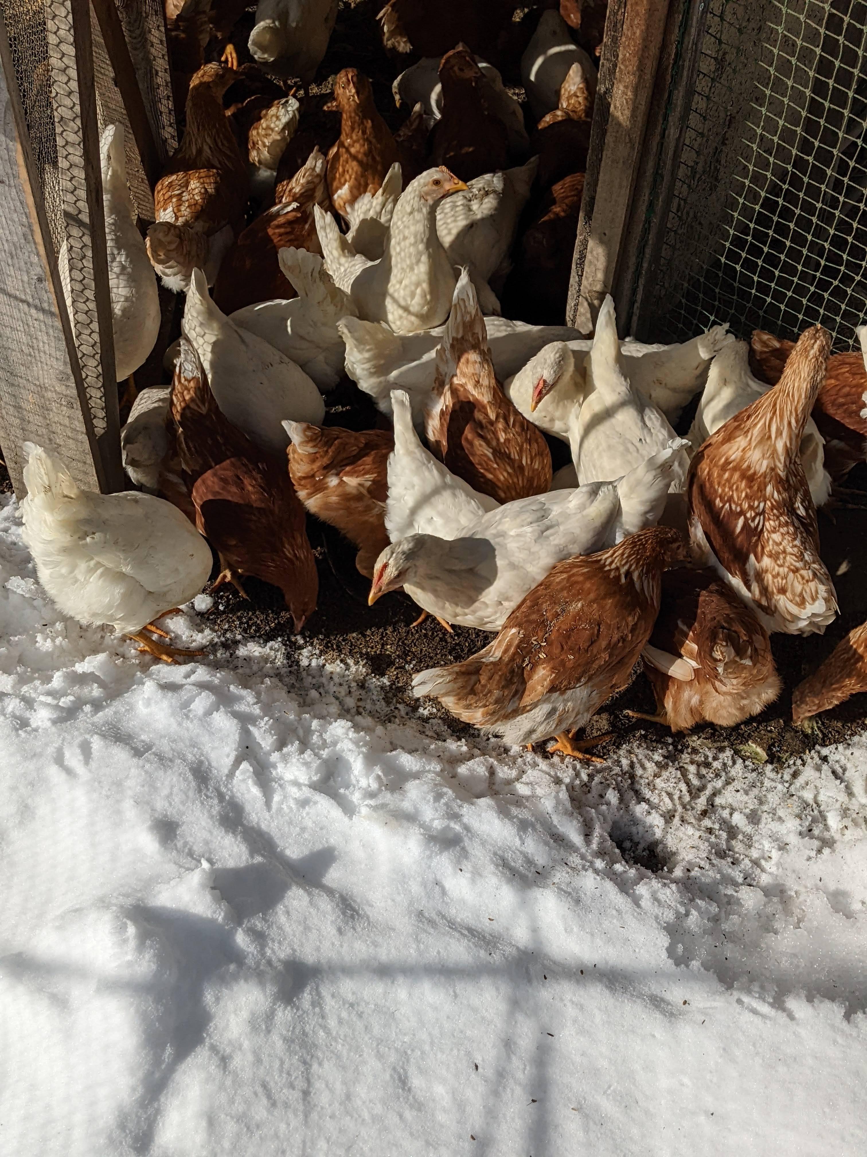長野では12月頃から雪が降ります。寒さに比較的強い鶏ですが、雪の上は大の苦手。雪が消える3月初め頃まで運動場は使えず、鶏舎内で過ごすだけになります。冬の間、外で遊べないストレスが弱い鶏に向かい、ボロボロになるトリが出ていました。100羽(3羽/㎡)から60羽(約2羽/㎡)に変更してからは、冬を越しても皆きれいなまま。むらたまのつつきは空間を確保することで解決しました。むらたまはこれからも2羽/㎡以下の薄飼いでいく方針です。