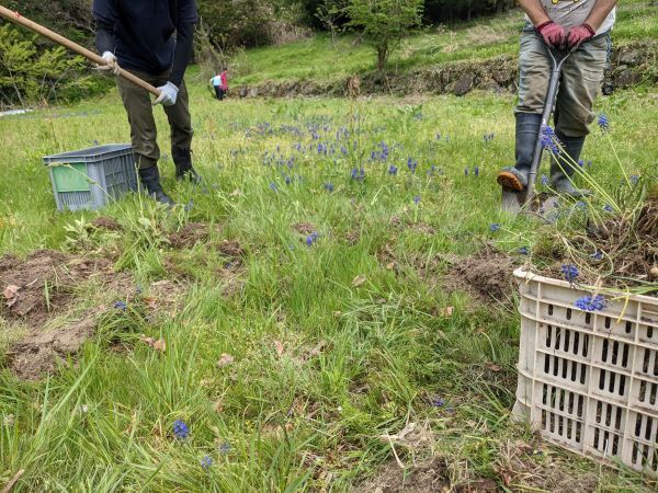 新鶏舎予定地はむらたま鶏舎に隣接する土地。すでに地権者の方の了解は得ています。全草が有毒のムスカリが群生しており、それを除去したり草を刈ったりして整備中です。