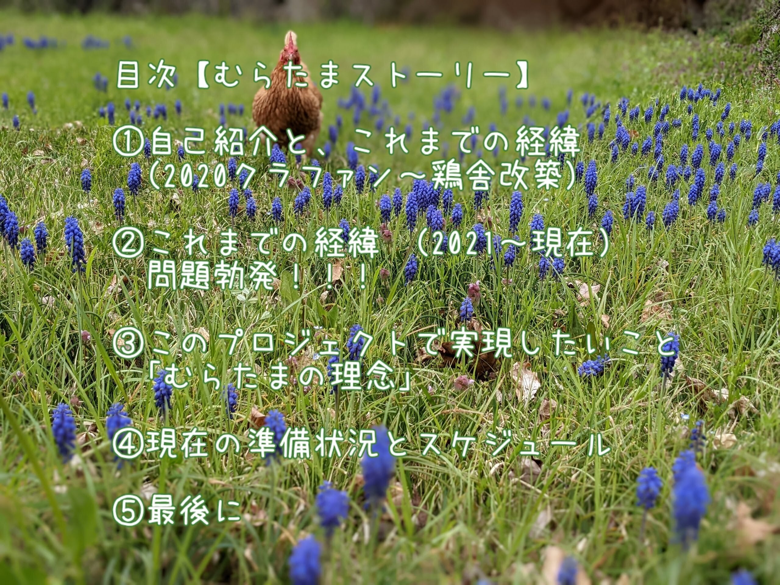 2024/10/16 04:008/12にスタートした本プロジェクトが10/12、無事にゴールしました。128名の皆様、ご支援ありがとうございました。・支援総額 1,614,000円・達成率230%でした。開始日にまったく動かず不安になっていたのですが一転、次々にご支援いただき、心底ほっとしました。むらたまの活動をご理解いただき、賛同いただけたことがとても嬉しいです。本プロジェクトでむらたまを初めて知ってくださった方も多くいらっしゃいます。挑戦して良かった!と思うとともに、どなたかが仲介くださったことを知っては手を合わせました。皆様に心より感謝申し上げます。ご期待に応えられるよう、真摯に取り組んでまいります。今後のむらたまを見守っていただけたら幸いです。***リターンにつきまして、順々にご案内しております。10月中にご連絡を差し上げる予定ですが、11月になっても連絡がない場合は大変お手数ですが、ご一報くださいませ。CAMPFIREのページは、この「活動報告」と「メッセージ」が今後も使えるそうなので、折々に発信していきます。なお、プロジェクト本文はもう変更できないとのことでした(トップ画像だけでもゴールしたものに変えたかったのですが、そんなわけでご容赦ください)。***鶏をゼロにして、夏の間、お休みをいただいた「むらたま」は9月末から動きだしております。インスタグラムやFacebookで詳細を発信しておりますので、ぜひフォローください。(リンクです↓)インスタグラム Facebook***以下は、インスタグラム&Facebookにて発信したものです。本プロジェクトのご支援者向けではありませんが、お目通しいただけたら幸いです。沢山の方々に支えられていることを実感しています。【むらたまクラファン2024にご協力いただきました皆様へ】日頃より大変お世話になっております。エサのご提供、卵やプリンの販売等ご協力のおかげで生業を続けられています。このたびのクラウドファンディングでも格別のご厚情をいただきましたこと、心より御礼申し上げます。皆様のご尽力により、当初の目標を大きく上回るご芳志をいただいただけでなく、本事業について多くの方々に知っていただくことができました。ありがとうございます。皆様の応援を糧にして、むらたまの理念を具現化し、地域・社会に貢献できるよう努めます。今後ともよろしくお願いいたします。下記はご協力いただいた皆様です。(書き忘れ、誤り等ございましたら、是非ご指摘ください)*順不同です■リターンご協力ありがとうございました!・evolve 様・山下薬局 様・野菜・米処 樹木 様・森の古民家あだむさんち 様・信州たかやまワイナリー様■応援メッセージをありがとうございました!・パン焼き小屋はしご 様・五岳館 様・野菜・米処 樹木 様・佐倉弘祐 様・森の古民家あだむさんち 様・長野ワイントラベル 様・嶋 啓祐 様■チラシを置いてくださった皆様、 配布いただいた皆様、 情報拡散くださった皆様、 ありがとうございました!高山村・Wine&Cafe ヴェレゾン 様・村の小さなピザ屋さん和 様・子安そば文の蔵 様・子安温泉 様・道の駅アンティロープ 様・平野屋 様・見晴茶屋 様・信州たかやまワイナリー 様・米農家どろんこ祭 様・山の野菜園といろ 様・Kaya Studio 様・藤田屋酒店 様・かめはら 様・ふるさとセンター山田 様・常盤屋 様・高山村観光協会 様・わらび温泉ふれあいの湯 様・山田温泉大湯 様・YOU游ランド 様・游々亭 様・松本木材店 様・レッドウッドイン 様・サンタ牧場 様・ヴィラ藤屋 様・食事処 一 様・清水ベーカリーコルぺ 様・姉川様・ペットサロンわん太くん様・アトリエリースリング様・ピカチェ様・takayamahub様・高山村ネット様・高山村役場様須坂市・渡辺豆腐店様・塩屋醸造様・一顆とりり様・山下薬局 様・ゲストハウス蔵様・中川 様・須坂新聞社 様小布施町・evolve様・OBUSE Meguru Lab.様中野市・野菜・米処 樹木様・五岳館様信濃町・siki様長野市・パン焼き小屋はしご様・整体処ねころび堂 様・香川 様・丸山 様・小林 様・ほっとパル 様小川村・大豆フード専門店 だいず食堂パチョコ 様・Bakery24sekki 様長野県外・竹中りんご 様・かくれん穂"様・田中 様・藤井様・山﨑様最後になりましたが、CAMPFIRE様および、伴走いただきました遊覧潜水様、ありがとうございます。いつも丁寧にご対応くださり、安心して事に当たることが出来ました。まずは無事にゴールでき、ほっとしています(これから残りのリターン対応を頑張ります)。Special Thanksりえさん&あやこさん もっと見る