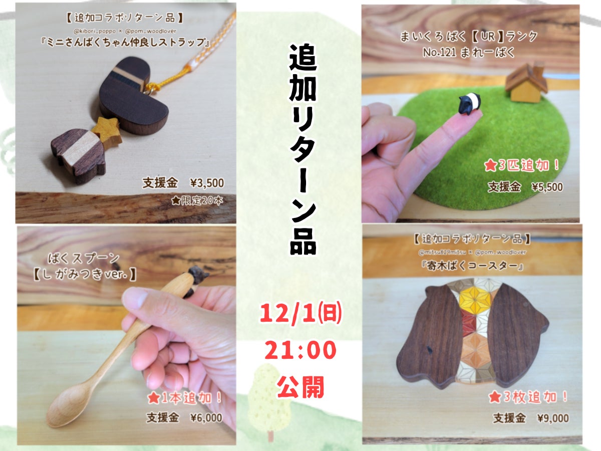 どうもー!木を愛し木に愛された男、木好作家ぽむです!セカンドゴールに向けて始動します!目標金額は80万円です!達成に向けて、追加リターン品を打ち出します!第一段:12/1㈰21:00〜・ミニさんばくちゃん仲良しストラップ・まいくろばく【UR】№121まれーばく・ばくスプーン【しがみつきver.】・寄木ばくのコースター一周目で逃した方は必見ですよ!ぜひ拡散やご支援のほどお願いします!◆バク展開催のプロジェクトページはこちら◆このプロジェクトにかける思いや、日々の活動報告はInstagramにて発信しておりますバク展公式アカウントはこちら木好作家ぽむのアカウントはこちら