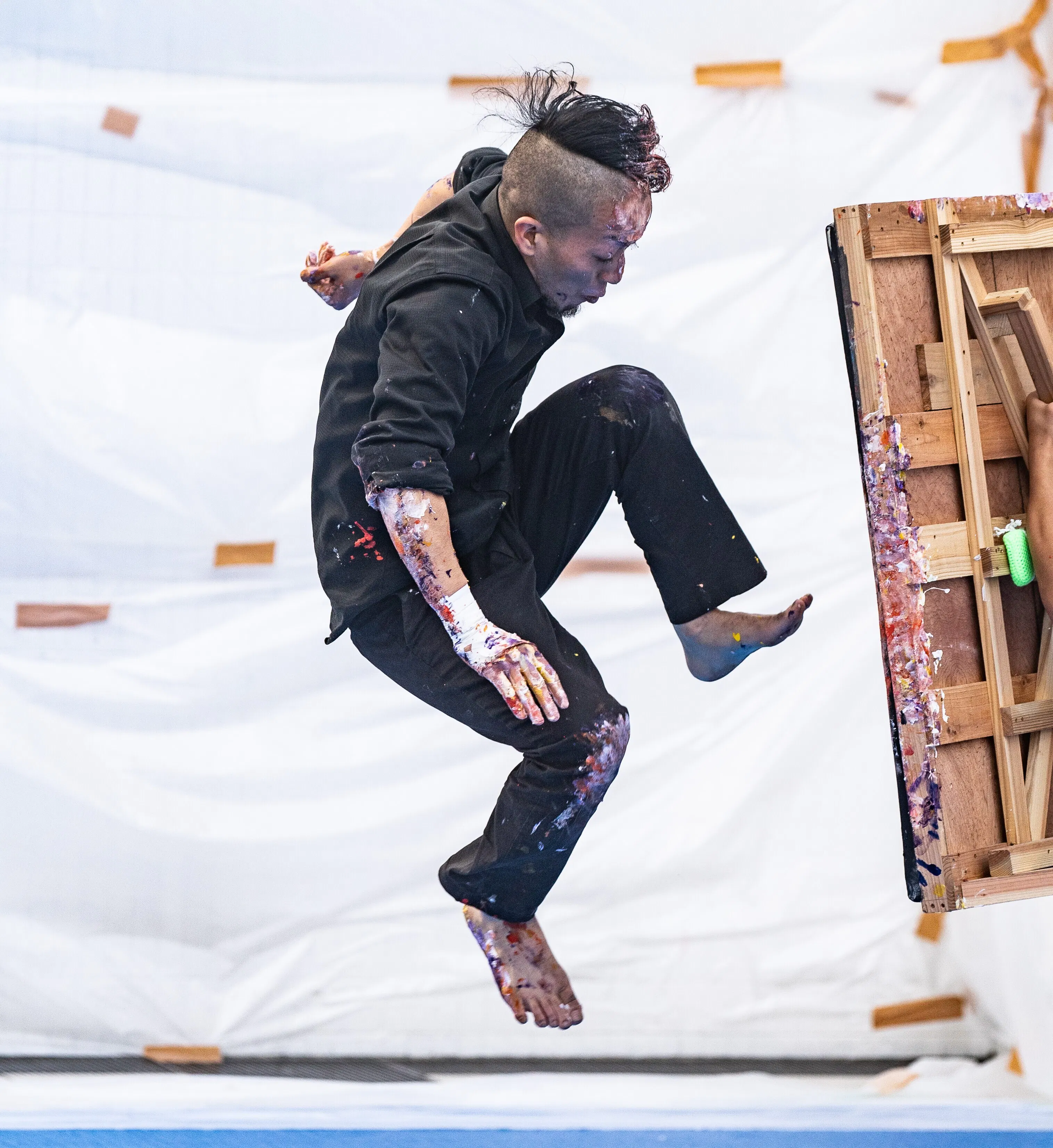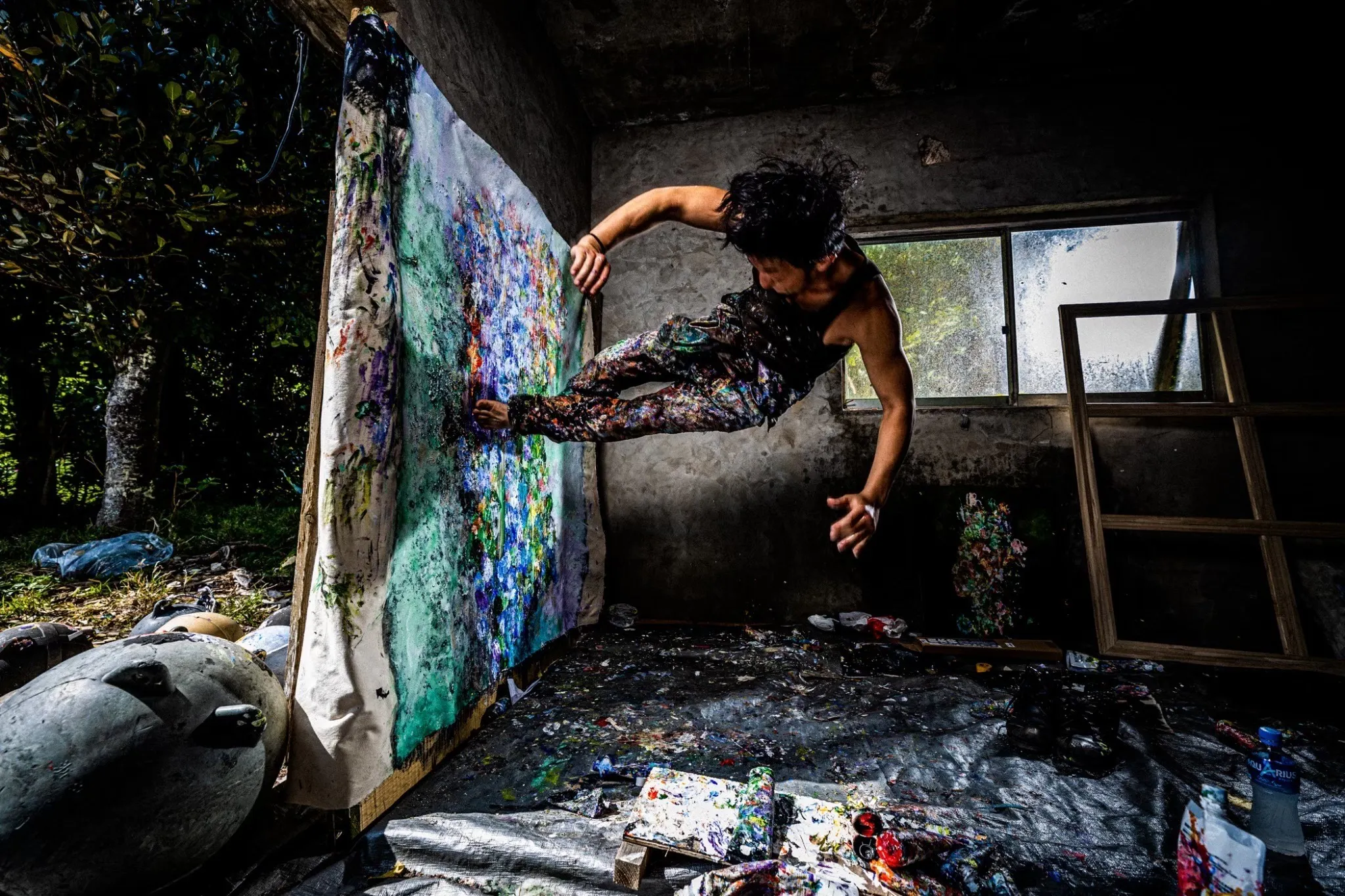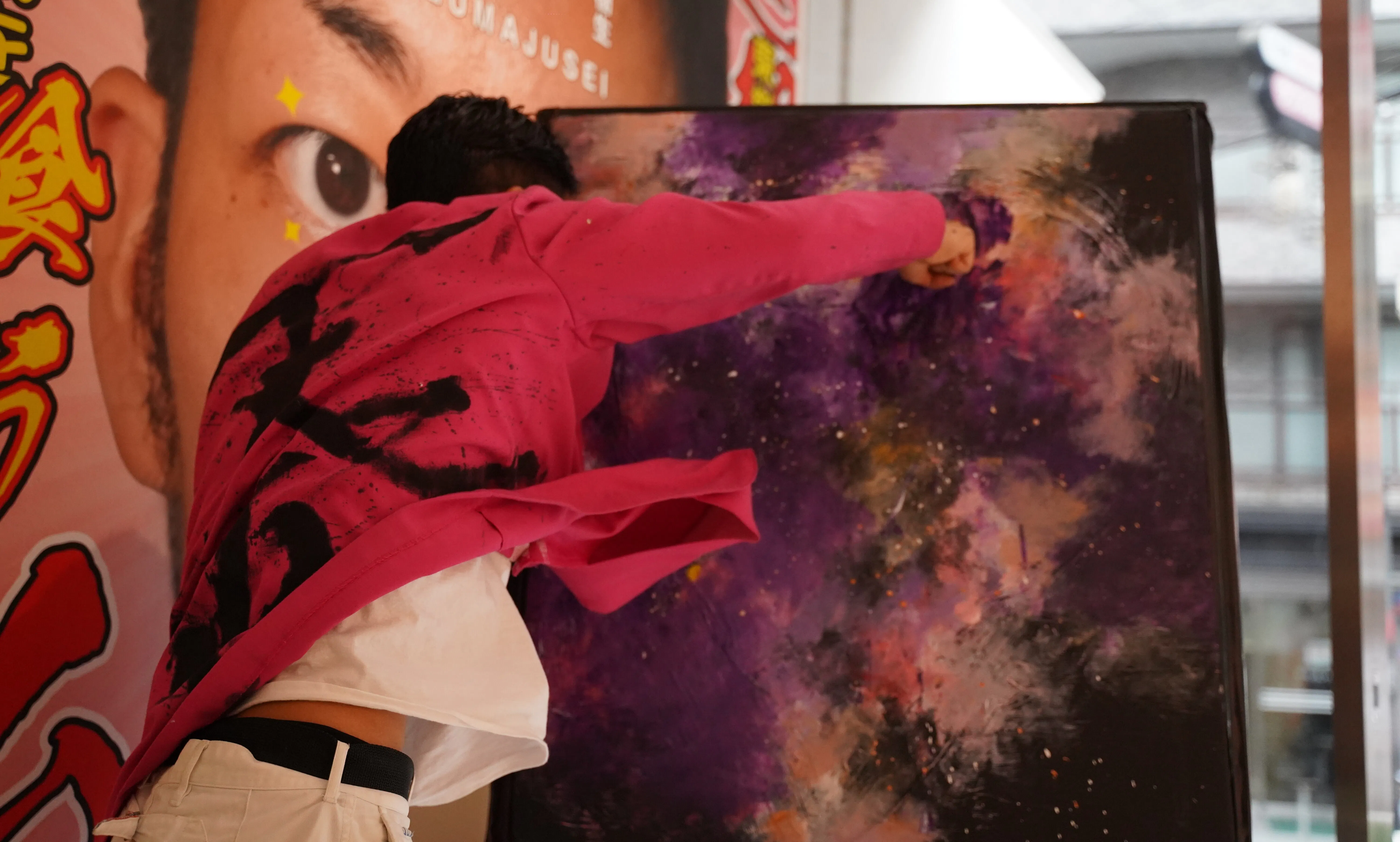 ヘッドバット、パンチ、キック、エルボーなどを駆使して全力で色を載せ、作品に想いや魂を込める唯一無二の表現です。