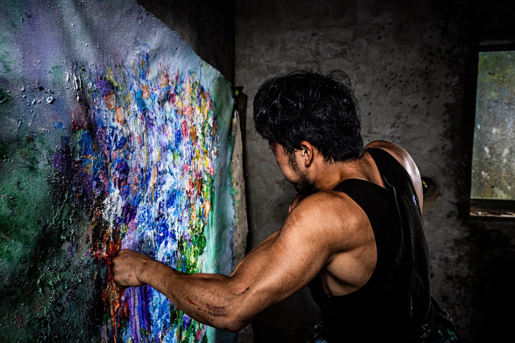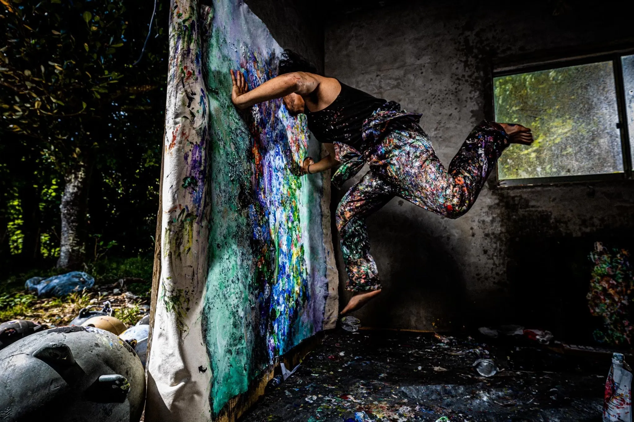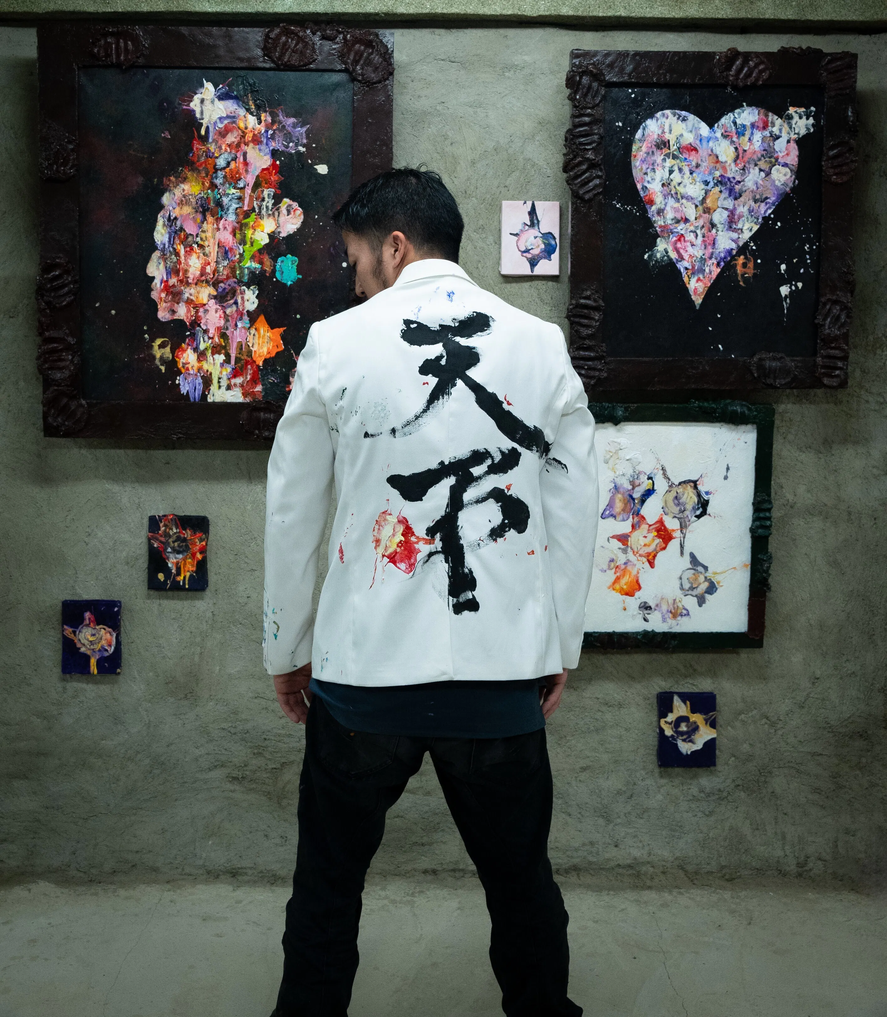 ヘッドバット、パンチ、キック、エルボーなどを駆使して全力で色を載せ、作品に想いや魂を込める唯一無二の表現です。