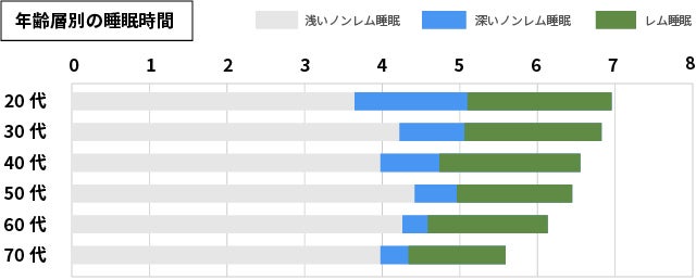 年齢を重ねると、徐々に睡眠時間に変化が現れます。深く眠るレム睡眠の時間帯が少なくなり、浅い眠りのノンレム睡眠が増加。睡眠中の途中覚醒も多くなり、全体的に浅い眠りとなります。